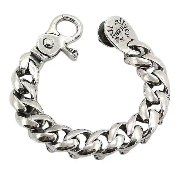 This piece is powerful, with a solid sterling silver construction and demanding presence. Every inch is polished to a high shine with darkened detail used to accentuate features. It lays comfortably on the wrist and secures with a chunky lobster clasp.