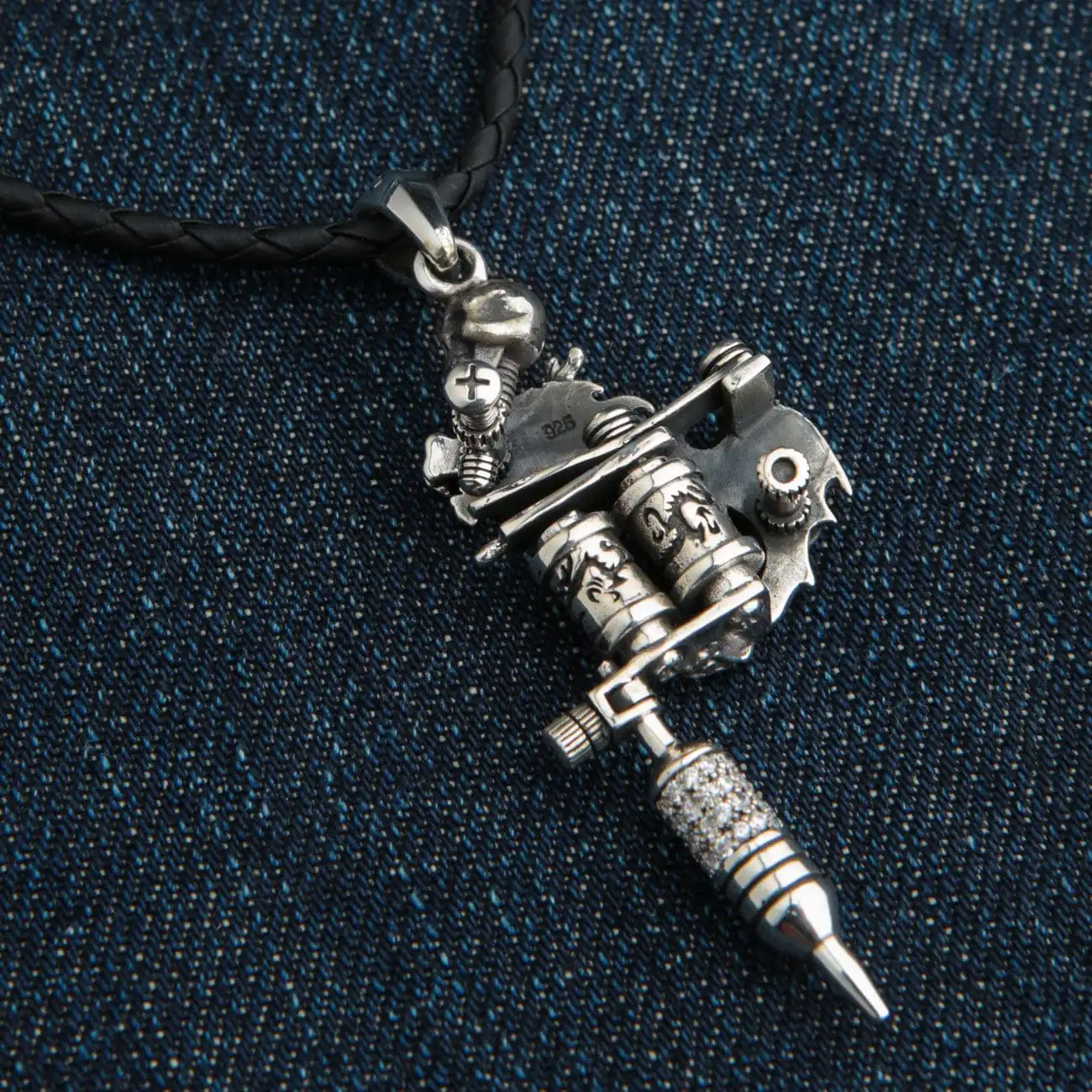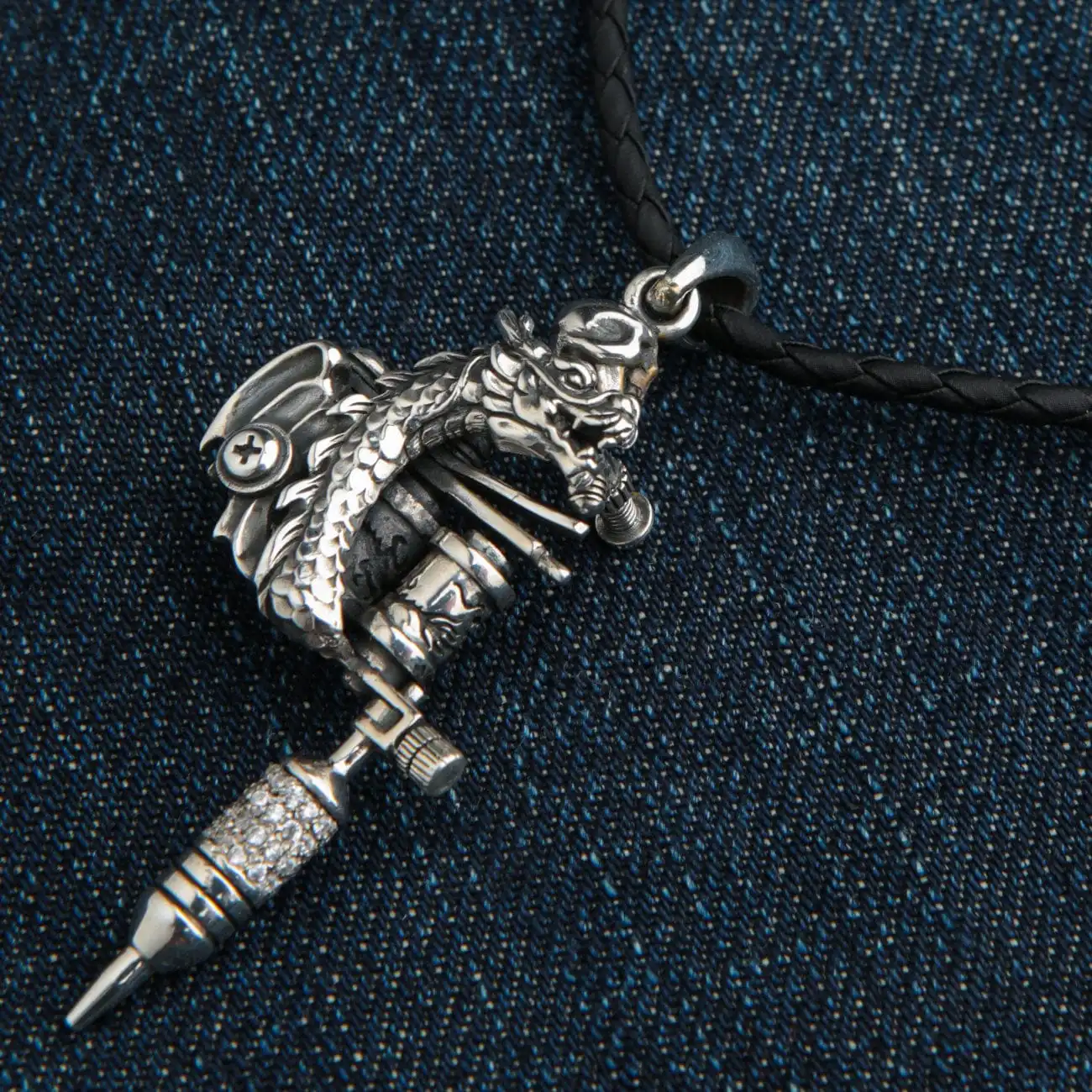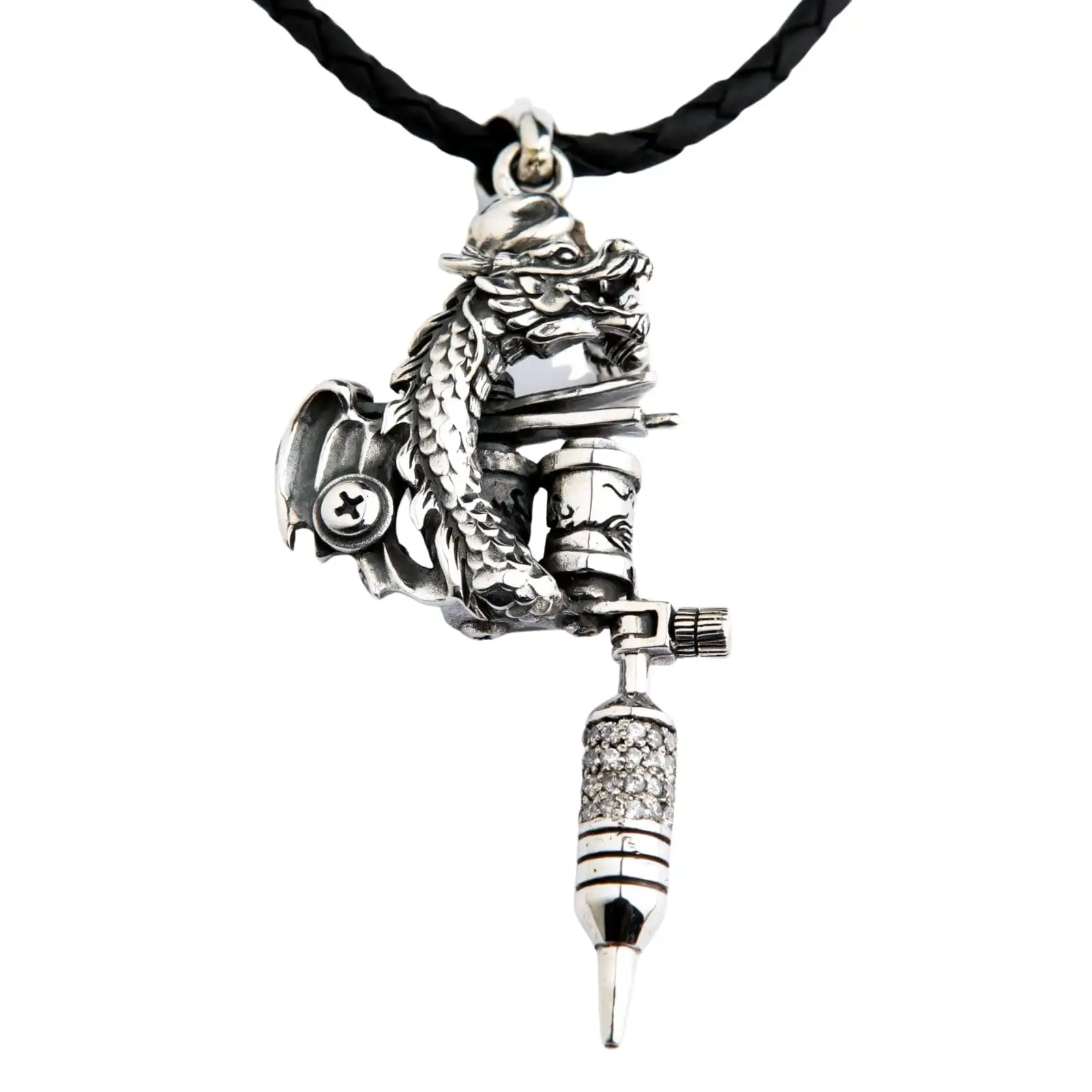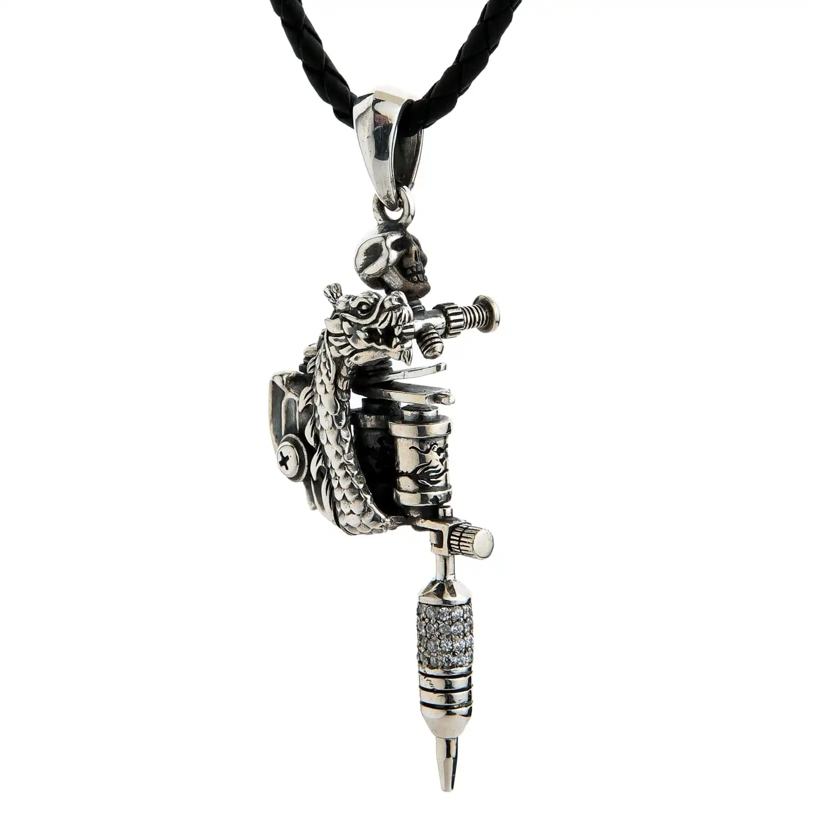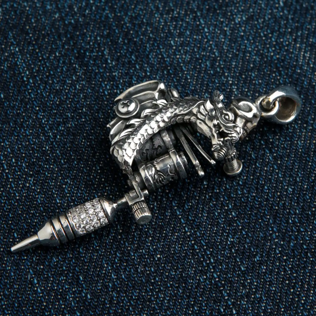 From the pointed tattoo needle that seems poised to permanently mark the skin through to the scaled dragon head that snarls from the body, every angle of this pendant is there to be admired.Providing a touch of sparkle and luxurious detail to this already impressive piece, the needle bale has been encrusted with diamond clear stones that capture the light with sparkling intensity. Wear around the neck on the chain of your choice as the compliments flow in and admirers wander up to take a closer look at this truly remarkable piece.