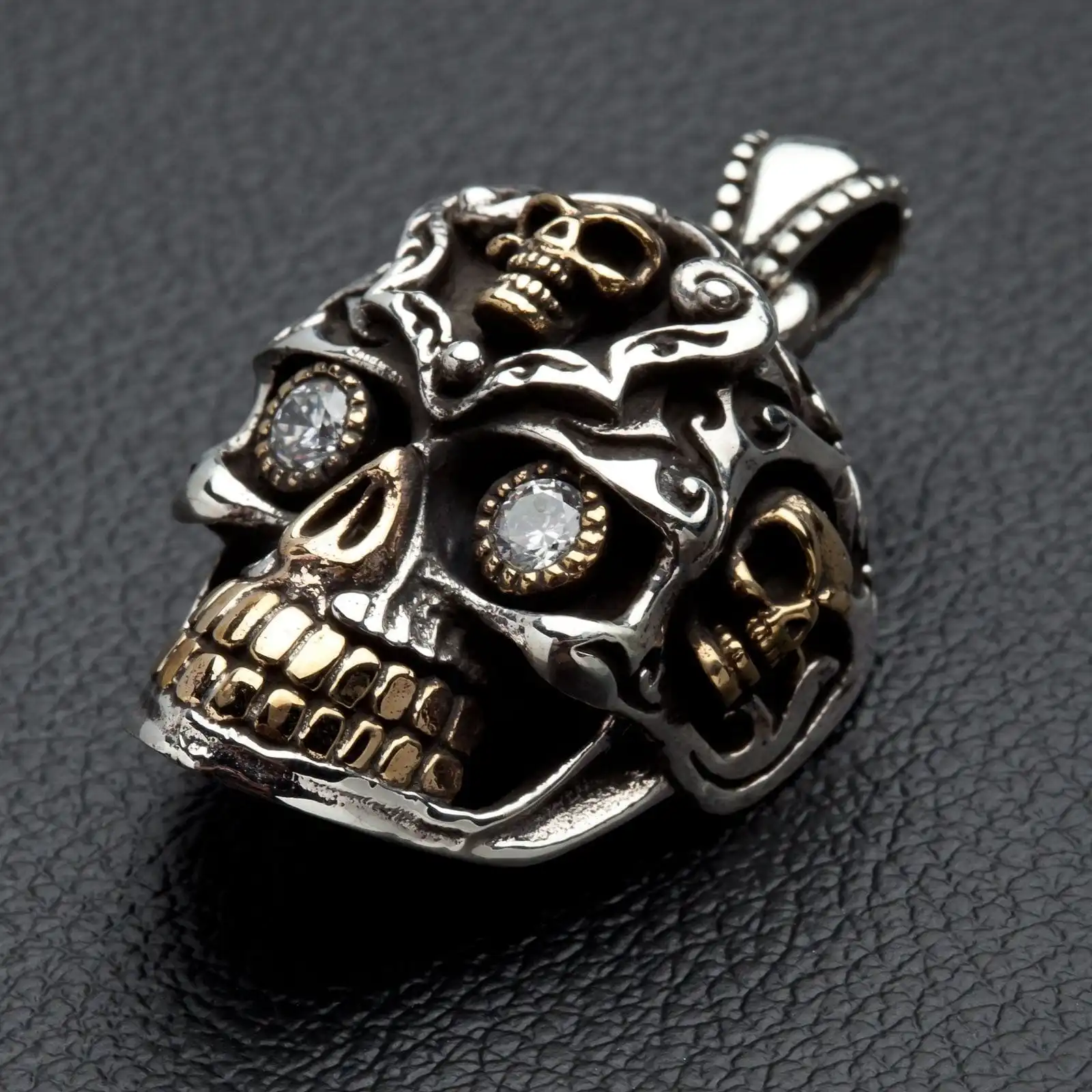 The clear, wide eyes of this diamond sugar skull of death give the pendant an extra creepy edge, as do the large, clenched teeth. Adorned with a smaller skull in the centre of the forehead and one on each side. this is a unique and interesting design, beautifully carved in a detailed and interesting style.