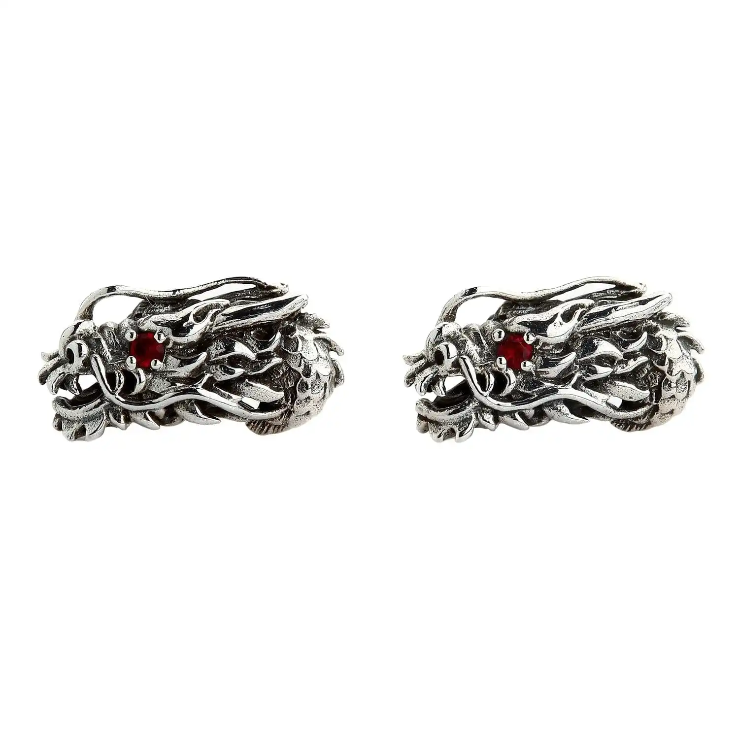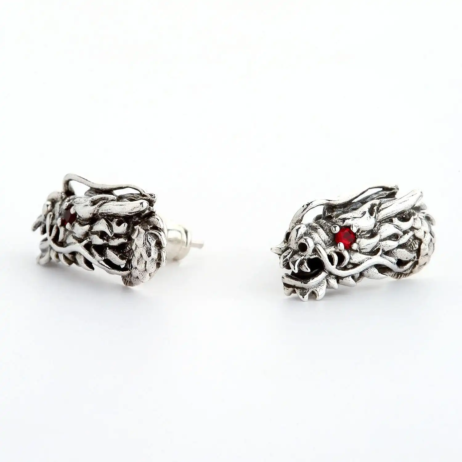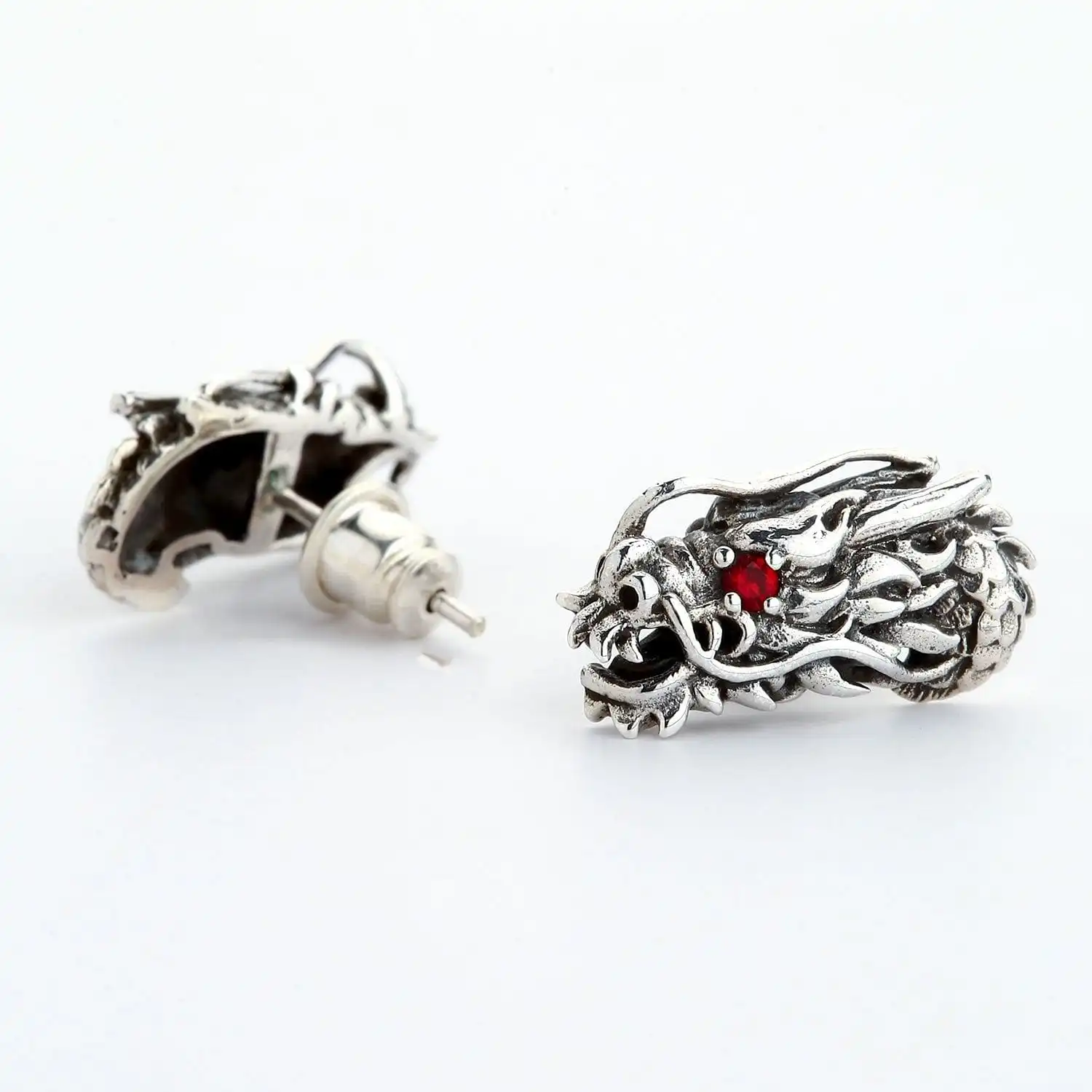 The earrings are made of high-quality sterling Silver that is said to have magical properties on its own. Teamed up with dragon symbolism, it becomes even more powerful and protective. Even if you don’t believe in the mystical powers of things, you are sure to appreciate the strong craftsmanship inherent in these studs. We crafted an intricate image of the dragon bristling with nice detailing and a combination of textures. Polished silver alternates with blackening thus giving the piece more expressiveness. The final touch is a red garnet eye inlay each dragon features.