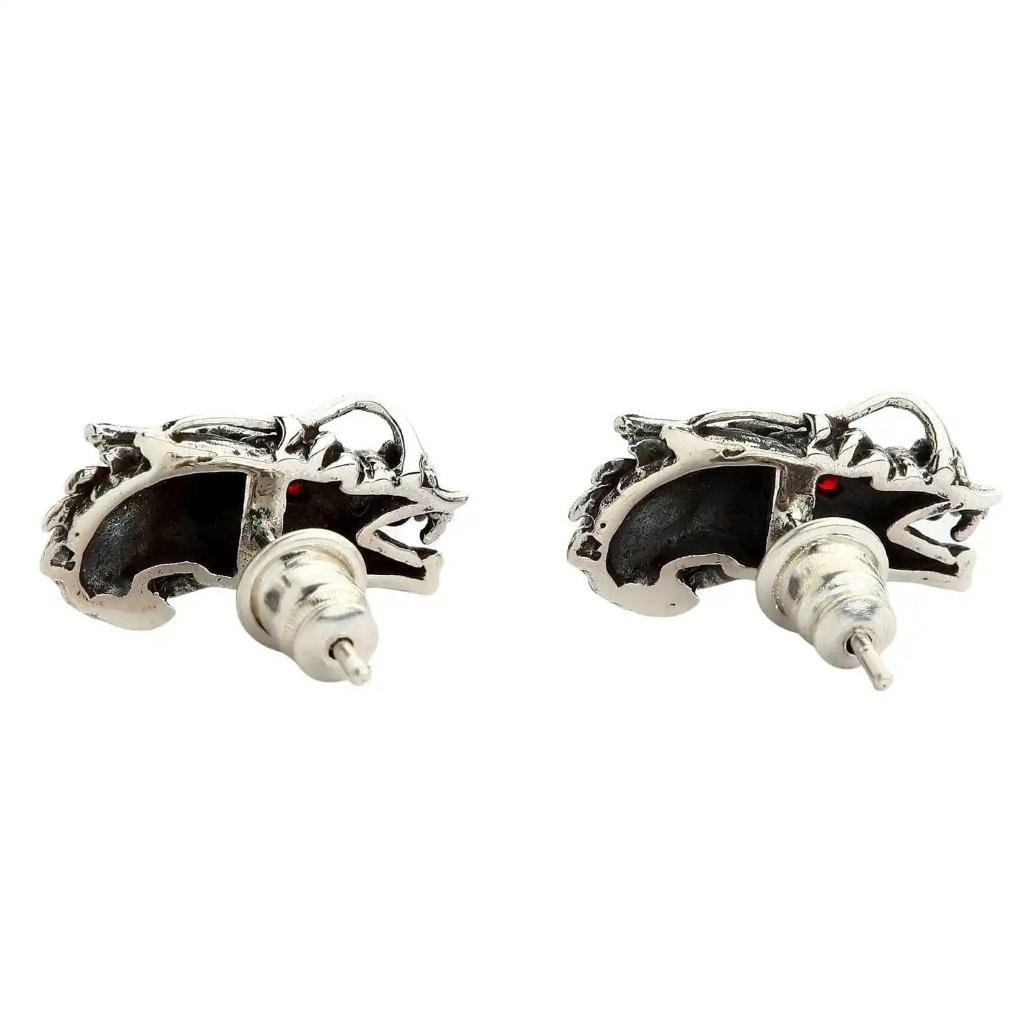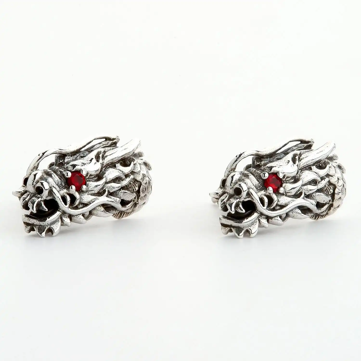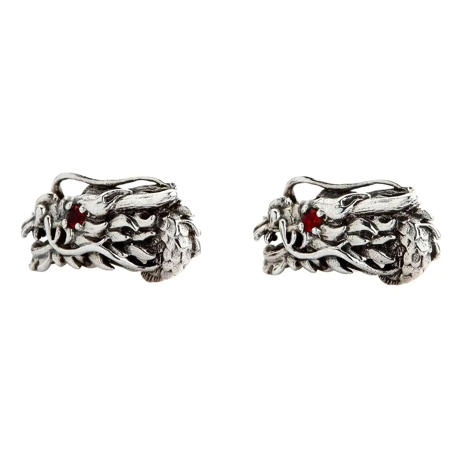 The earrings are made of high-quality sterling Silver that is said to have magical properties on its own. Teamed up with dragon symbolism, it becomes even more powerful and protective. Even if you don’t believe in the mystical powers of things, you are sure to appreciate the strong craftsmanship inherent in these studs. We crafted an intricate image of the dragon bristling with nice detailing and a combination of textures. Polished silver alternates with blackening thus giving the piece more expressiveness. The final touch is a red garnet eye inlay each dragon features.