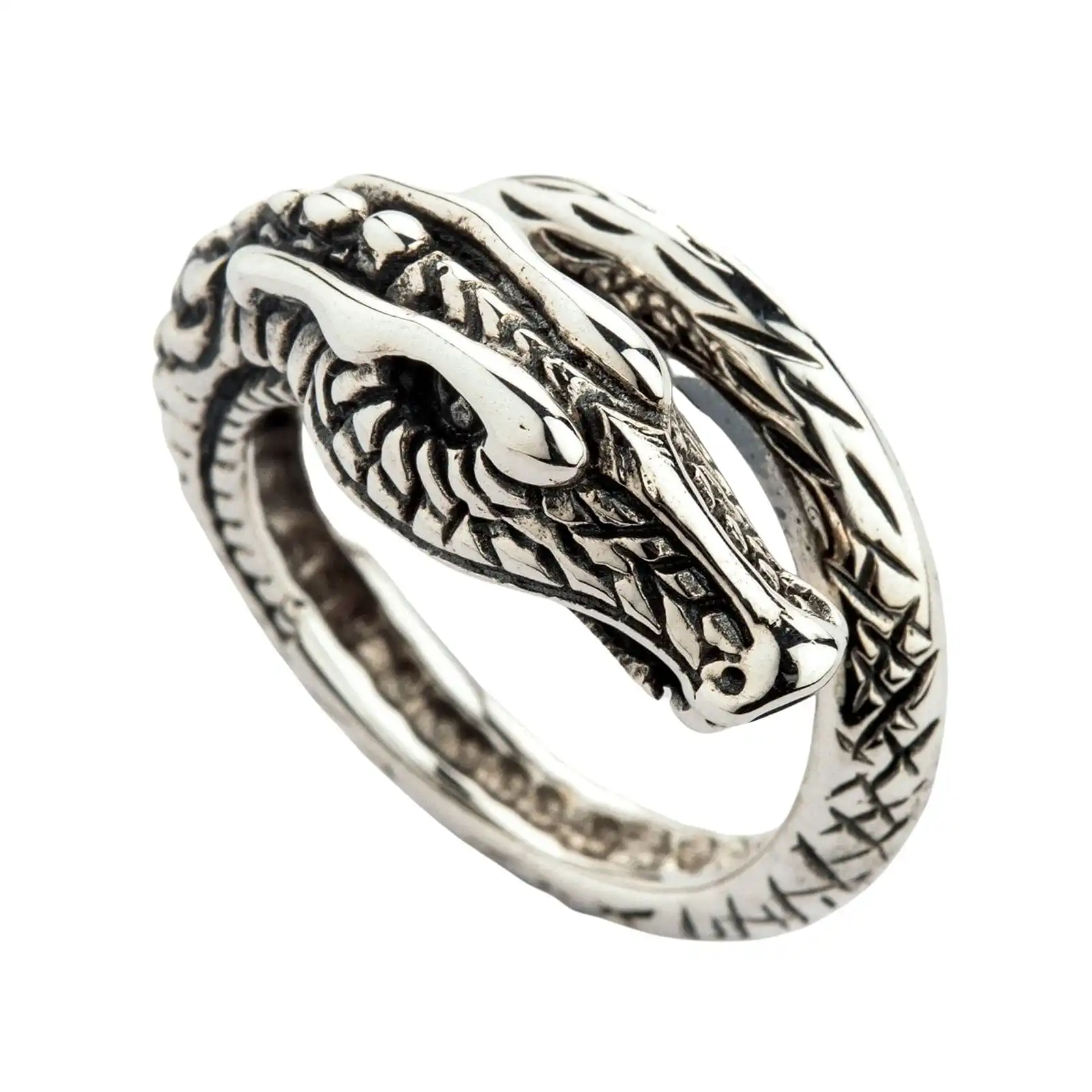 This Sterling Silver Dragon Mens Band Ring will quench your thirst for dragon jewelry. Expertly made to send shivers down your spine, it is able to add an exclamation mark to every ensemble you rock.