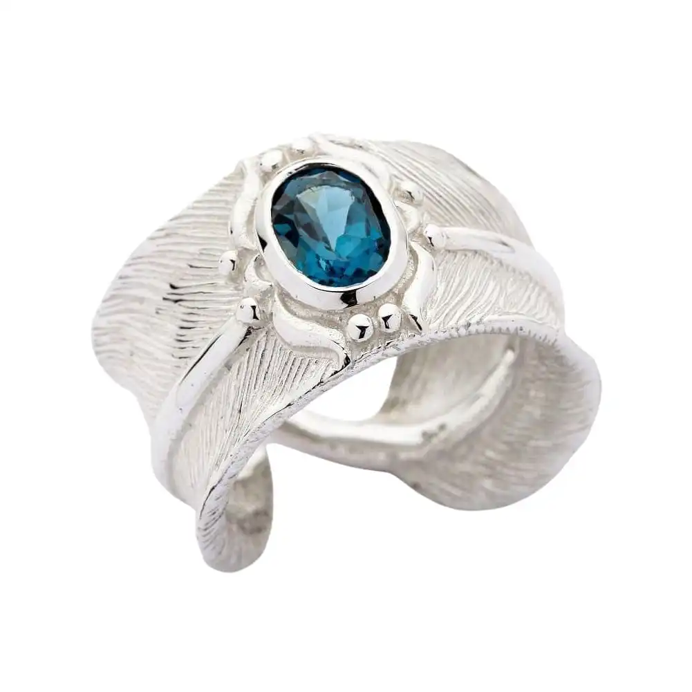 The lightness of a feather, solidness of silver, and hardness of topaz are skillfully combined in this sterling silver feather ring. Radiating royal nobility, this rings is a must-have for a lady desiring her style to pack a punch.