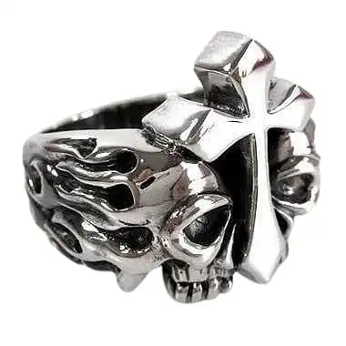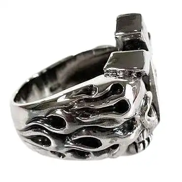 This one of a kind ring combines three of the most widely recognized biker symbols- skulls, crosses, and flames. Intricately designed and carved by expert craftsmen, this ring is a must-have for any biker ring collection.