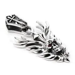 This piece takes its inspiration from gothic design – from the glaring face of an ominous skull through to the billowing flames that encircle it. Creating a stark contrast, two red garnet stones sit nestled within its eye socket – catching the light and flickering their menacing warning to all who gaze over.To finish, the classic bale has been re-imagined and transforms into a cross-adorned coffin. The pendant sits flush against the neckline, for comfort underneath jumpers and leather, and provide the finishing look to any rugged outfit.