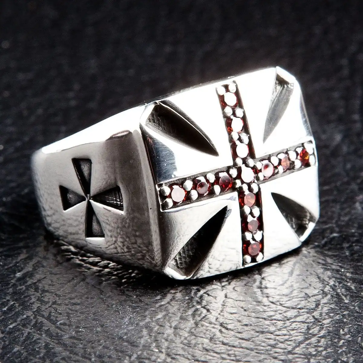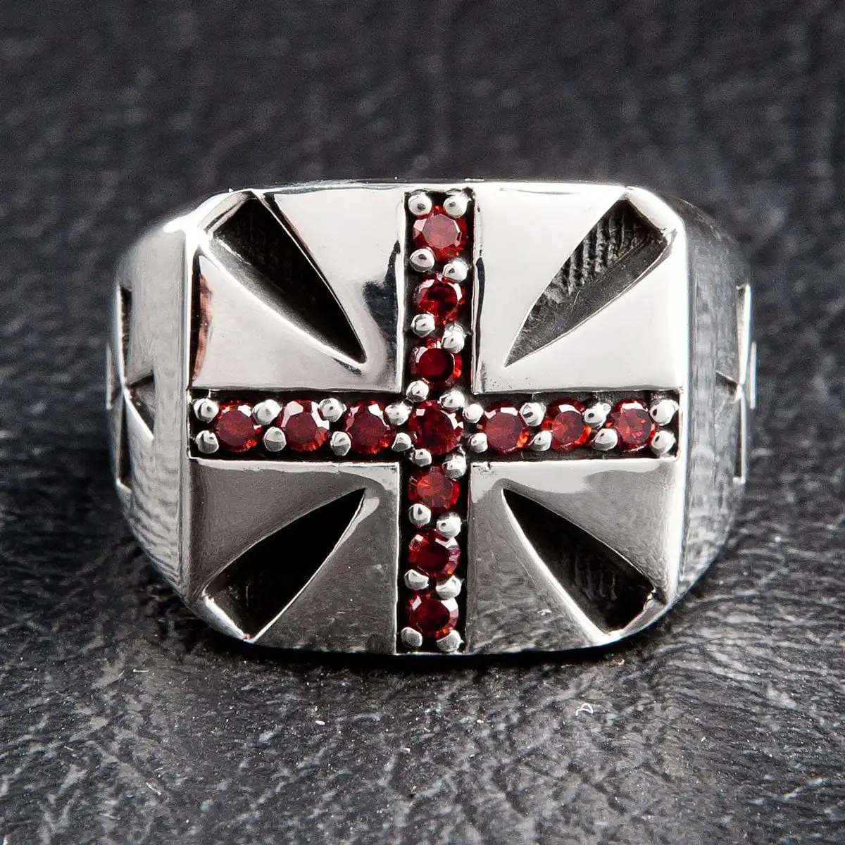 Garnet Red Inlaid Sterling Silver Cross Biker Rings