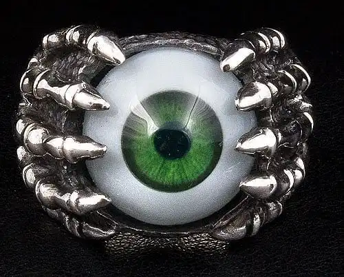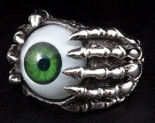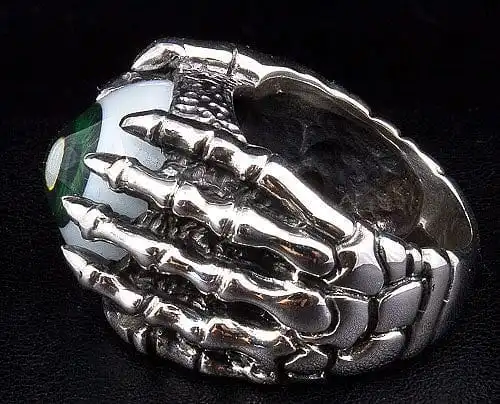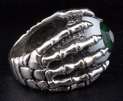 Made of solid sterling silver, this stunning piece is set with a large green eyeball, held in pace with dragon talons and claws. The heavy ring design is tough and rugged, perfect for any biker ring collection.