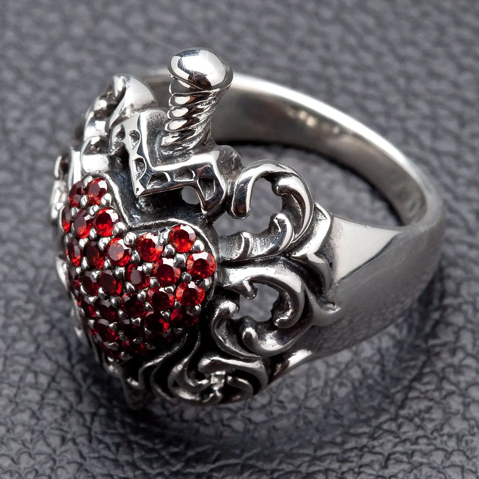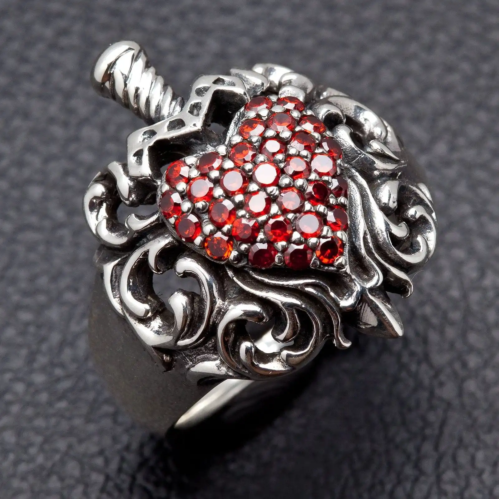 925 Sterling Silver Gothic Red Garnet Heart Dagger Ring