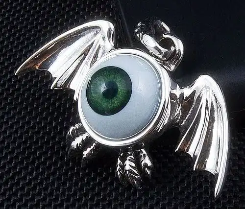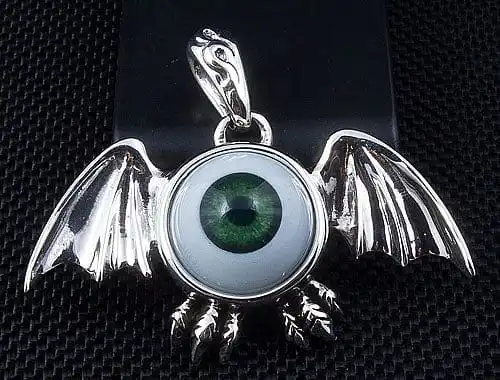 The design of this pendant praises some of the most common Gothic symbols. The eye renders the All-Seeing Eye, an ancient symbol of God and Illuminati. Christians believe that the eye watches over every person on his or her way through youth, adulthood, and older age. By itself it represents consciousness, soul, and perception.