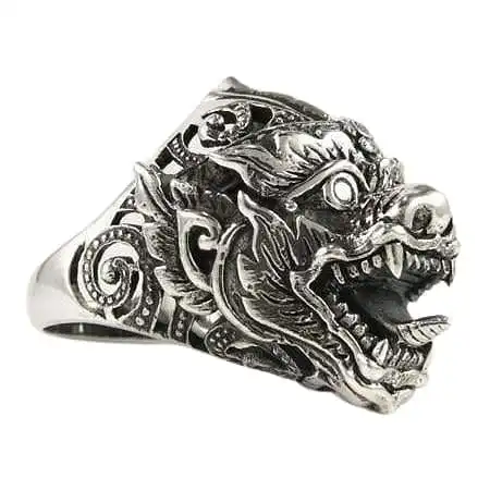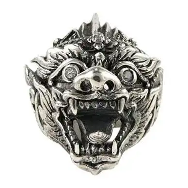 Crafted entirely by hand, this rare ring is unique to anything else on the market. From the clear stone set eyes through to the fearsome mouth and windswept fur, this piece speaks to the skill of our craftsman. It has been made from solid sterling silver for a premium weight and darkened to accentuate each feature.