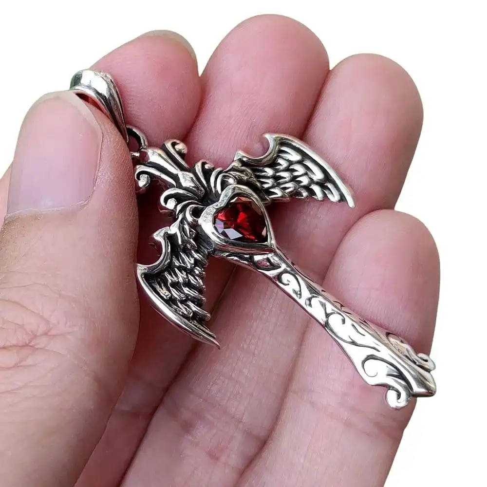 Red garnet stone heart wings sterling silver gothic pendant ~New