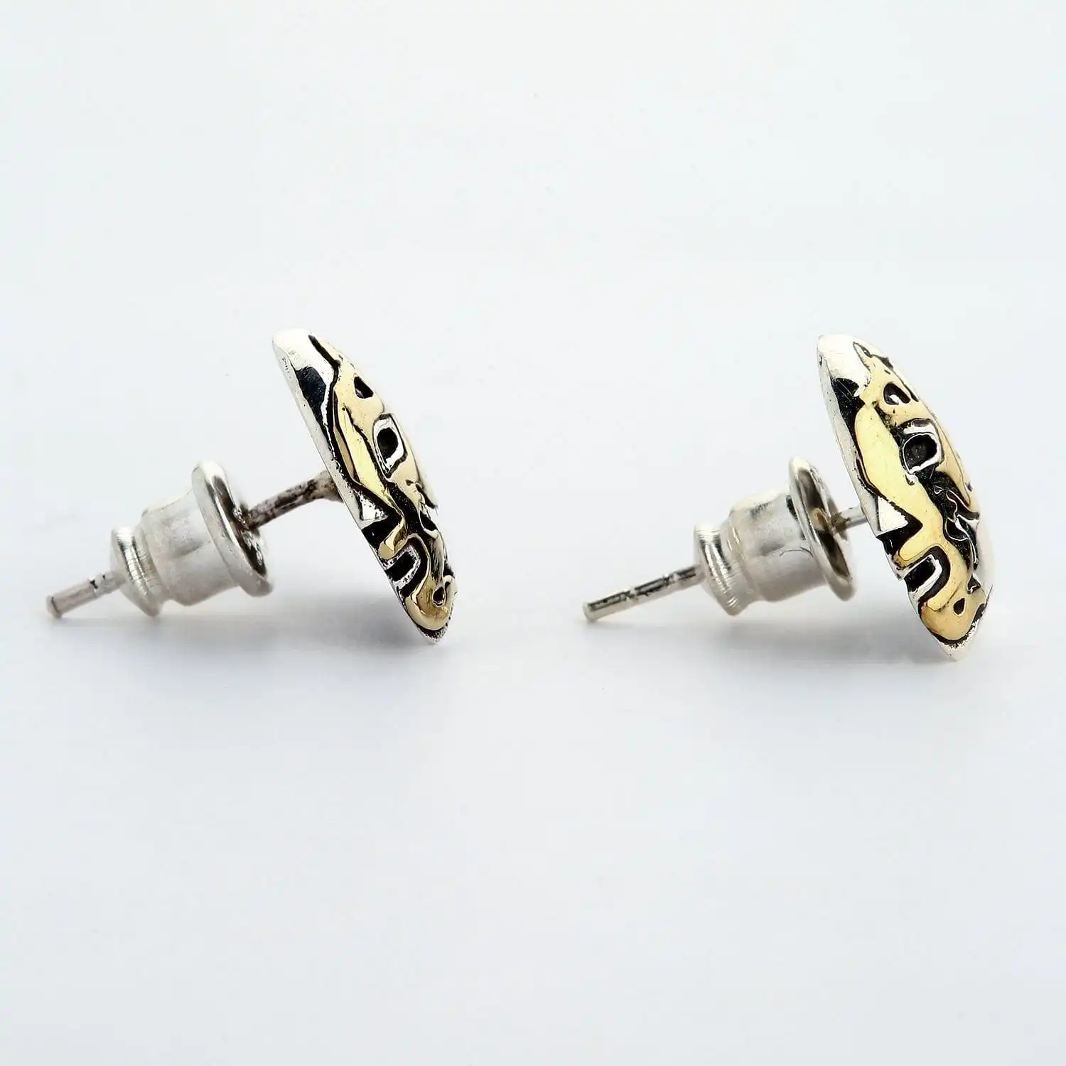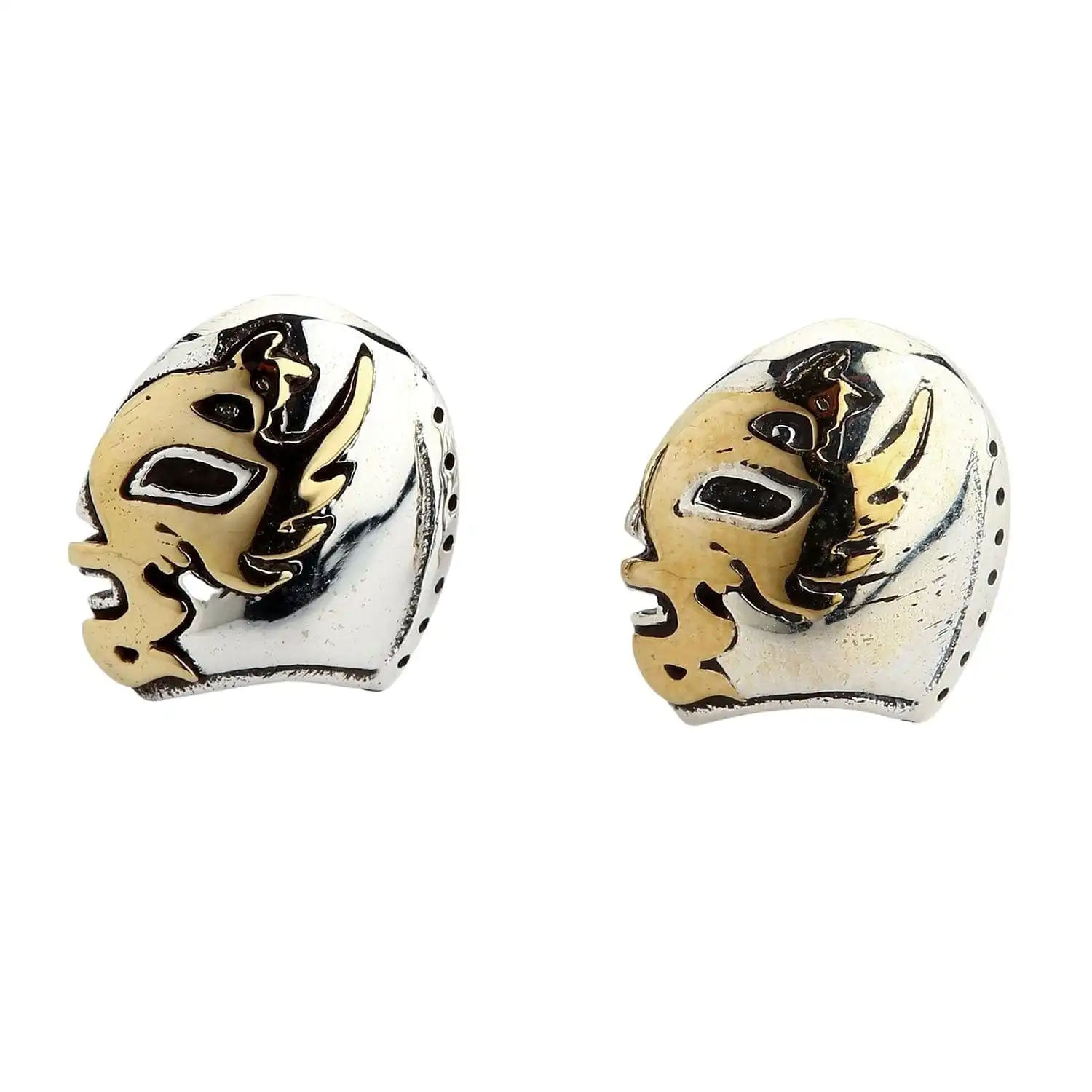 The earrings pay homage to colorful and creative Lucha Libre masks. They display a couple of wrestlers wearing intricate masks resembling a bird with spread wings. The mask detailing is made of copper while the rest of the earring is 925 sterling silver. Thanks to the combination of yellow brass, white silver, and blackening elements, the earrings look edgy from near and far. Make sure to browse our jewelry inventory for a matching Lucha Libre pendant.