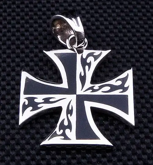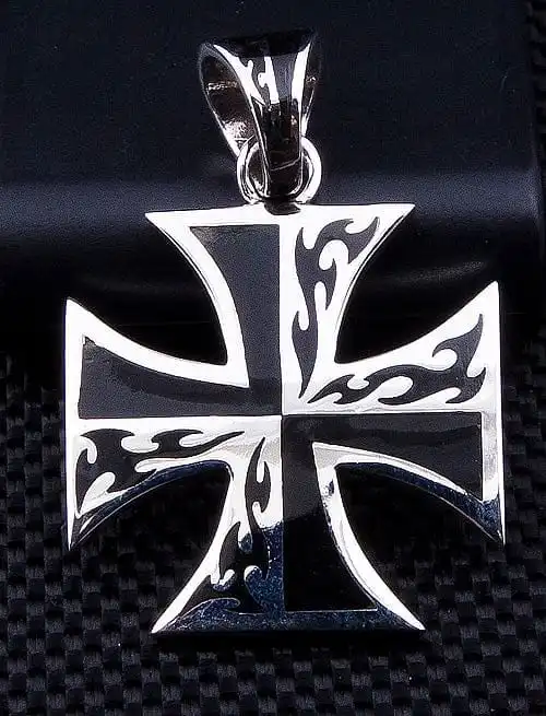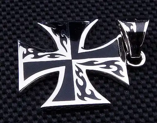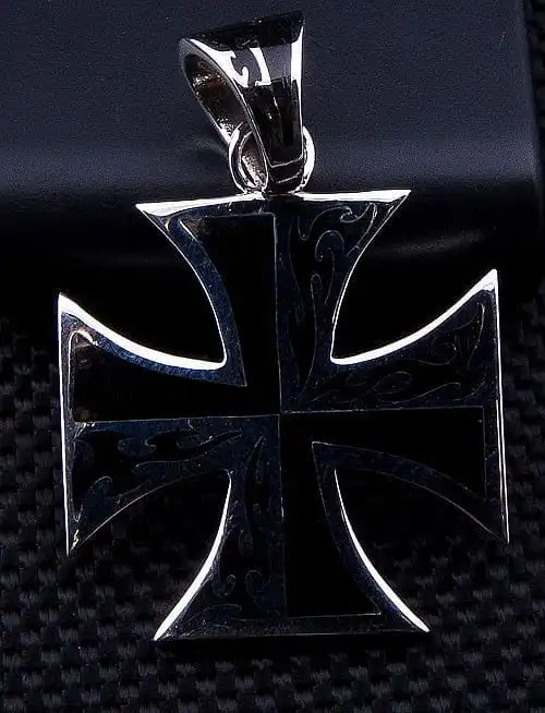 This Maltese cross Pendant is a cross with arms of equal length, which broaden from the centre. The spaces between each arm appear to be a shallow V, added to the overall appeal of this pendant.