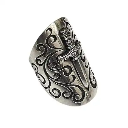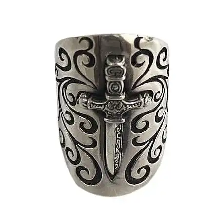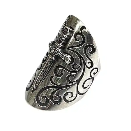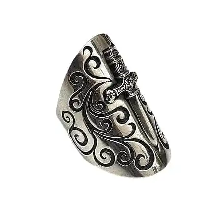 Enveloping the entire finger, our Medieval Shield Sword Ring is a sign of true protection. This large and statement ring takes control of any situation. The curved shield embraces the finger and displays a captivating design of intricate medieval swirls and markings. Within this, the sharp and decorative blade of a fighter’s sword sits prominently – a warning to all who choose to venture near.