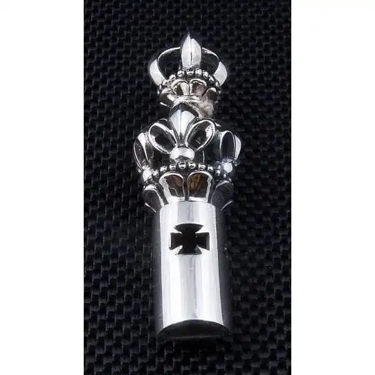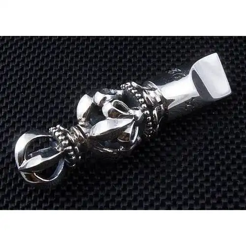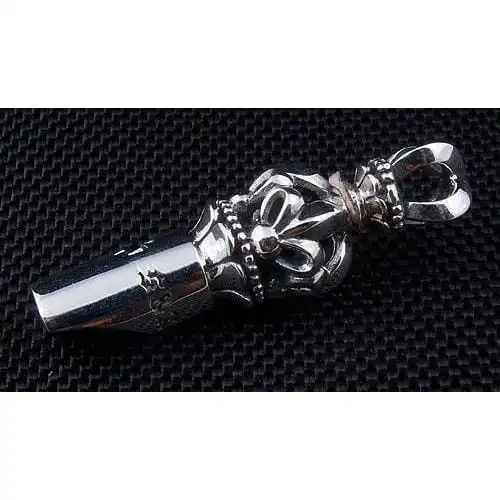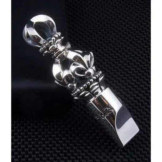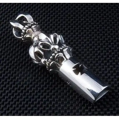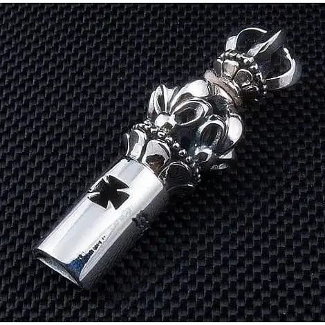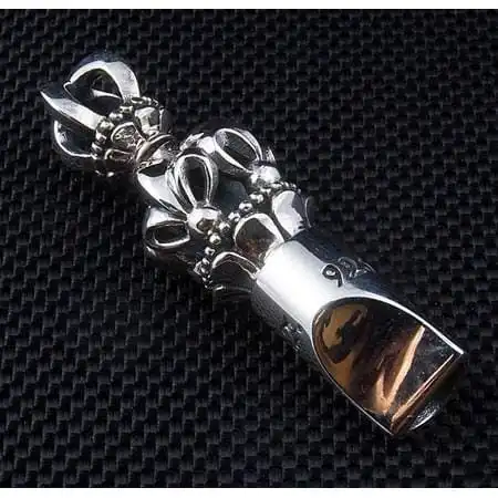 Our Master Craftsmen uses solid sterling silver to mould the whistle design, adding fleur de lis and cross detailing along the body for striking effect An ornate crown takes centre stage in place of a traditional bale and provide a sense of regal beauty to an accessory that already promises to impress.The whistle is also fully functional, creating a sharp whistle when air is blown through it. Alert everyone to your arrival and ensure your accessories are truly appreciated with this one-of-a-kind whistle pendant.
