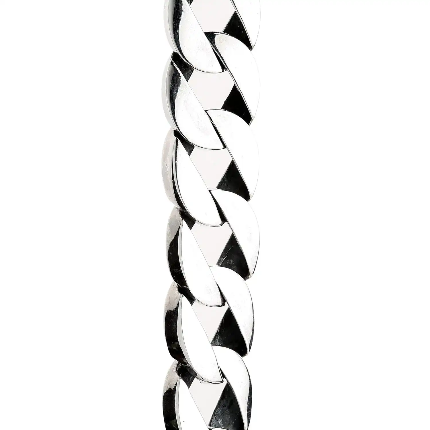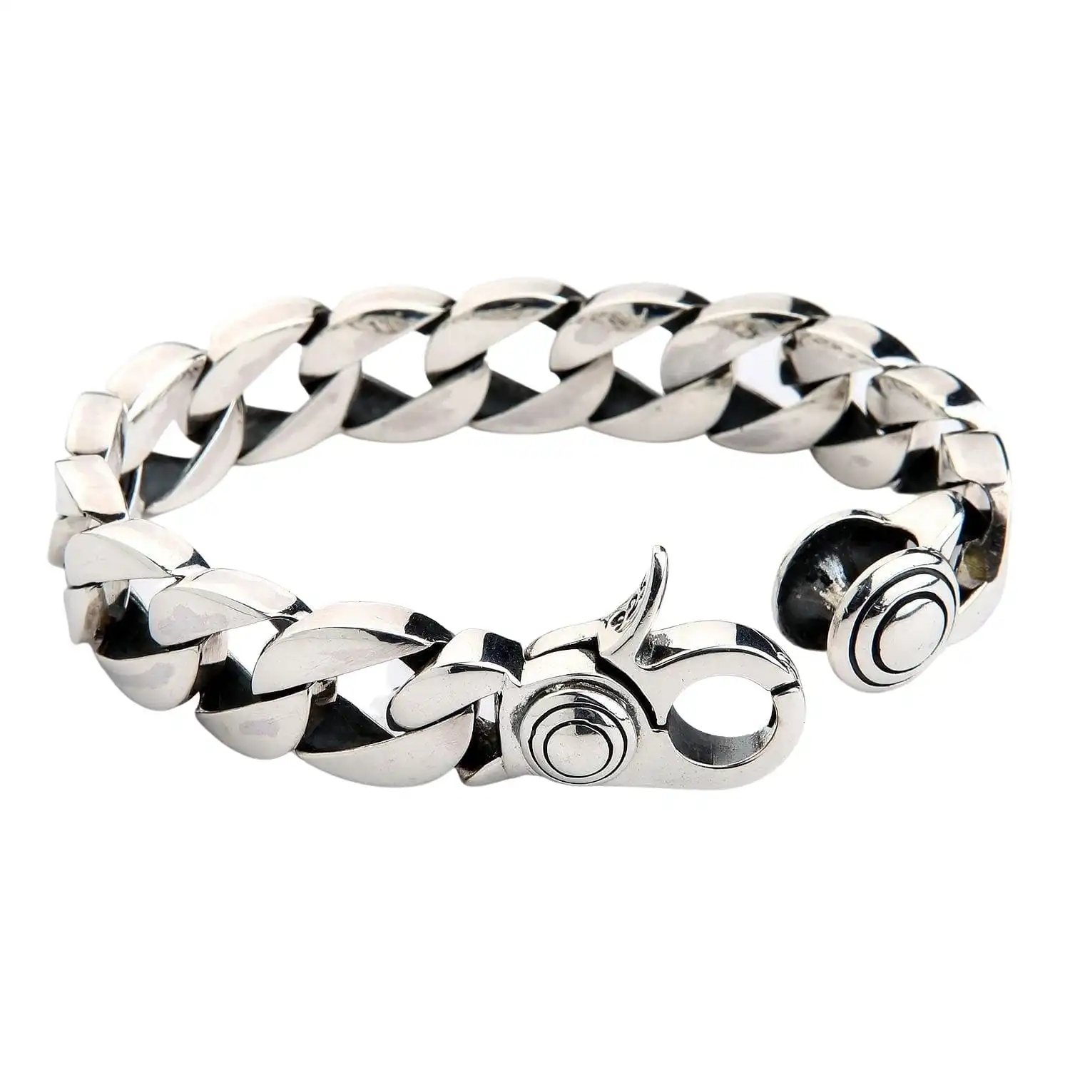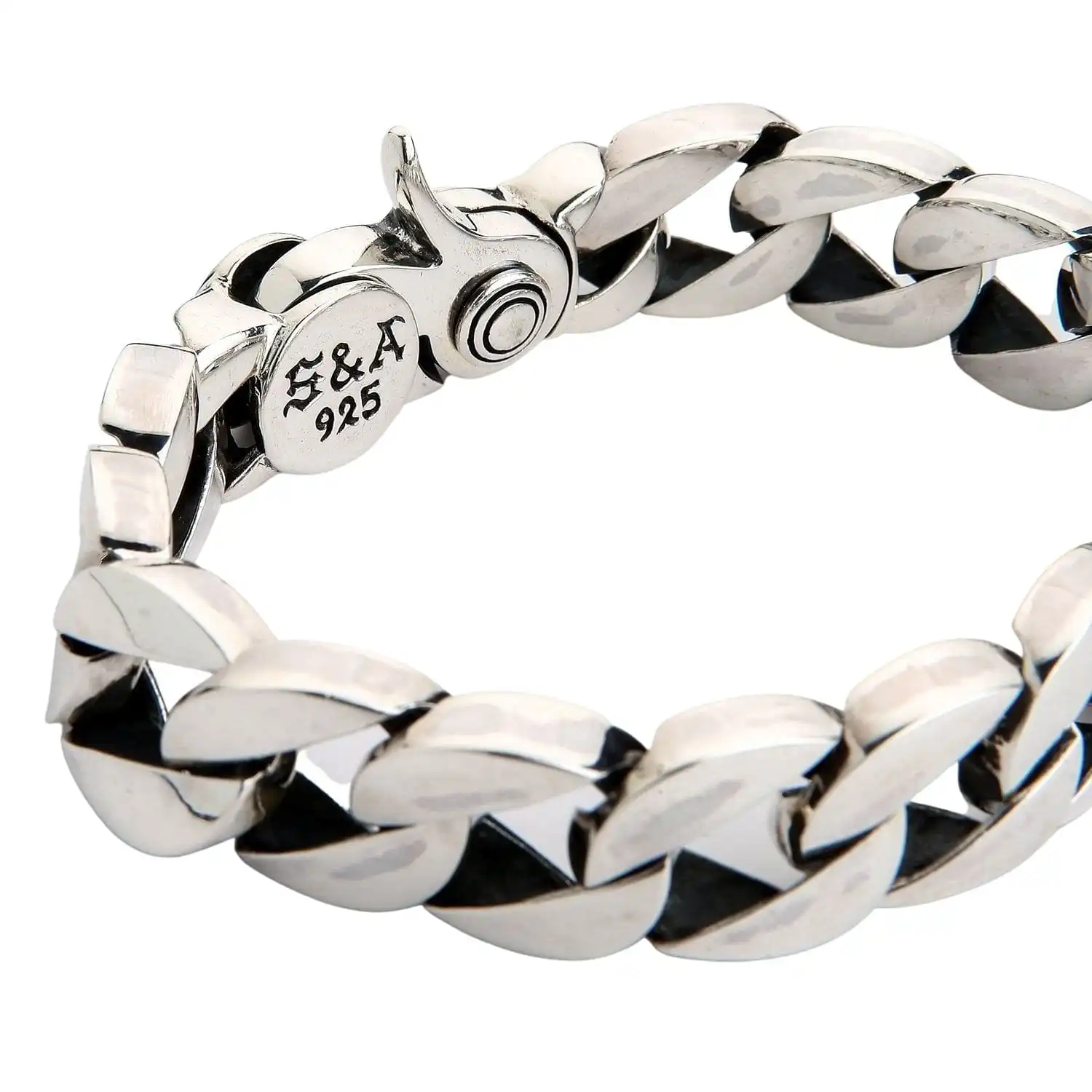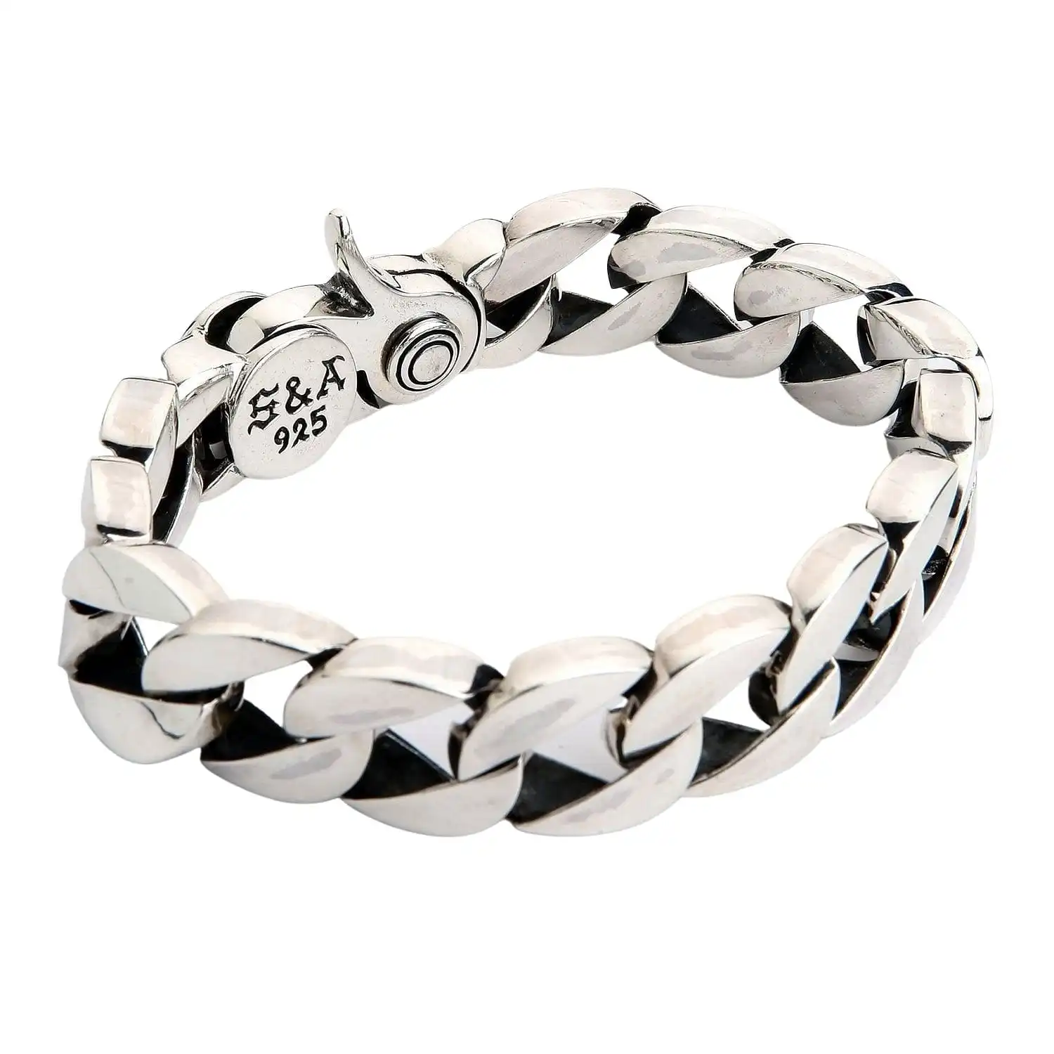 Don’t let its price put you off. Almost 100 grams of high-quality sterling silver are worth it. The noble metal is organized into curb (Cuban) links known for their durability and a rather flat geometry. Unlike other bracelets that are large but hollow, this piece is made of solid metal. This means that it won’t fray, bend, or break over time. Instead, it will convey a formidable feeling every time you put it on your wrist.