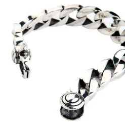 The bracelet features a stout lobster claw closure that attaches to a round detailing spruced up with a circular design. The clasp carries 925 marking that refers to precious sterling silver. The bracelet is available in two lengths – 8” and 8.5”, and its width is impressive 0.6” (16 mm). You’ll be glad to learn that we made this piece by hand including casting, assembling, and polishing. That’s why you can count on superb quality and unsurpassed durability.