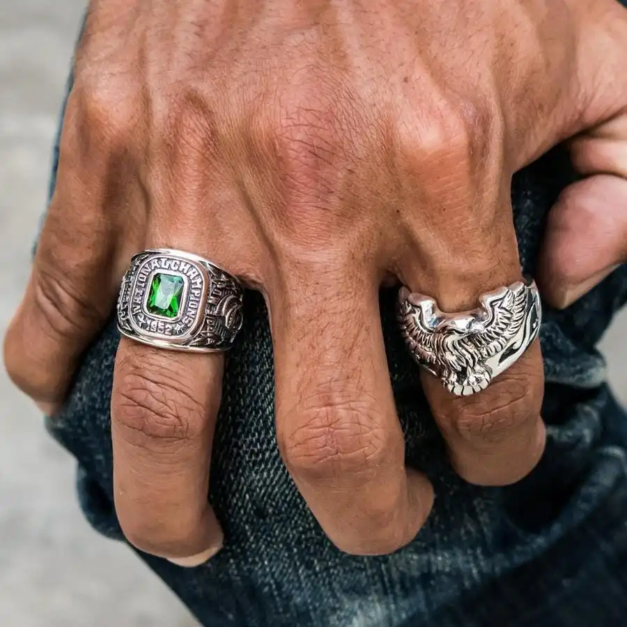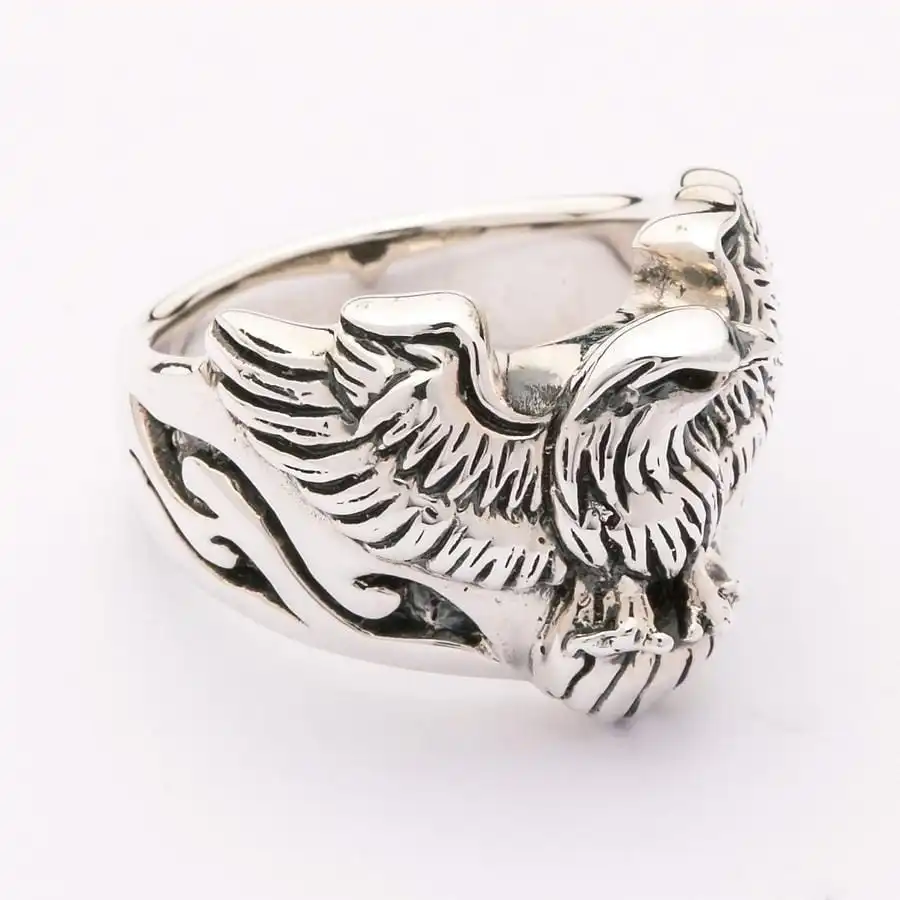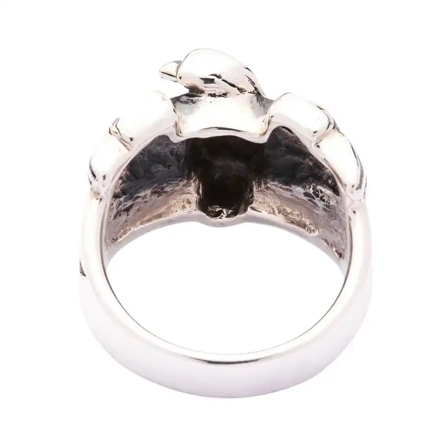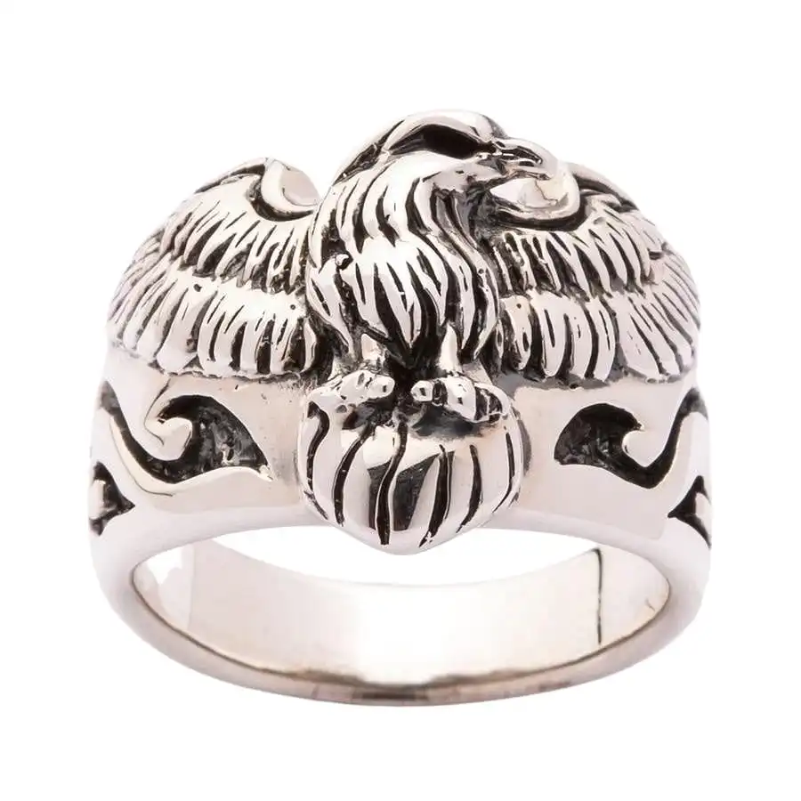 This heavy, thick cut sterling silver men’s ring features a breathtaking eagle design with remarkably crafted carving detailing the extraordinary wings, talons and face of this incredible bird of prey.