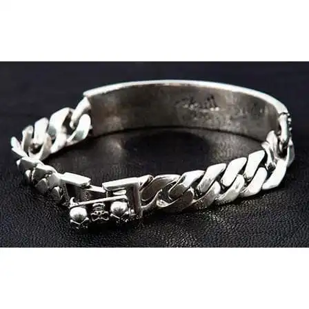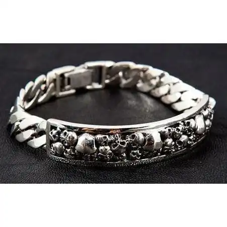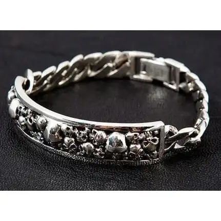 Different sized skulls have been used to decorate this bracelet. The skulls give it a masculine appearance, whilst the chain adds to the fierce appeal.