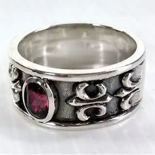 With classic style, this ring has enough class to impress any man. Everything from the iconic Fleur De Lis through to the inlaid ruby red stone at the centre allows it to stand out. A simple polished band slides comfortably on to the finger and sits on its own, or alongside rings of a similar style. This piece is one that will find its way into your style more than once.