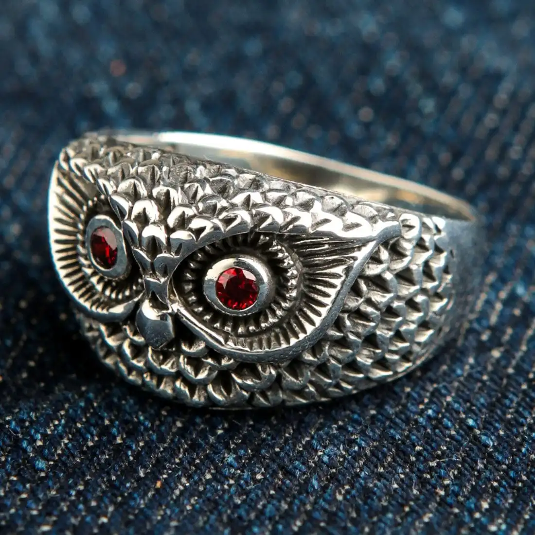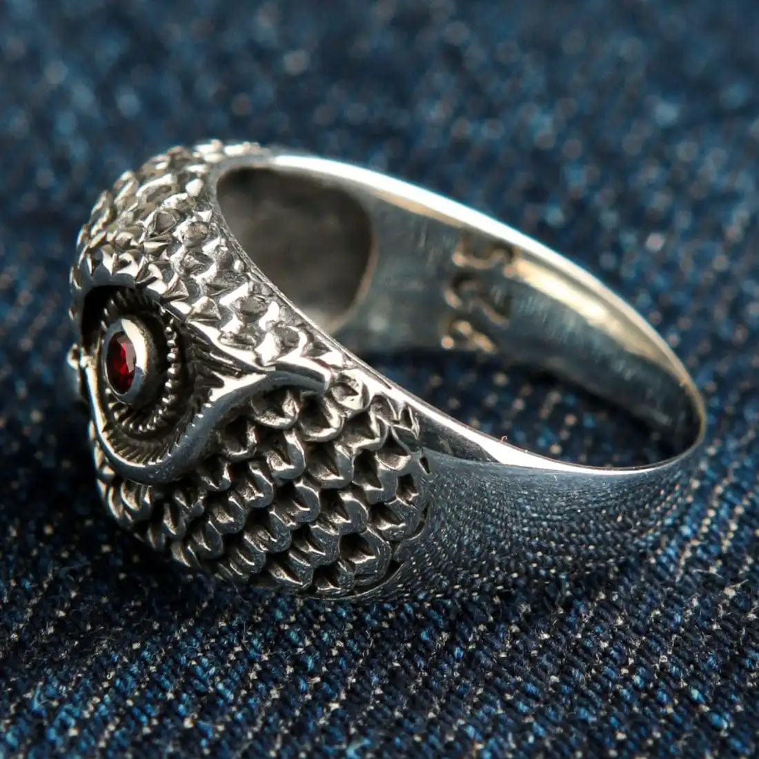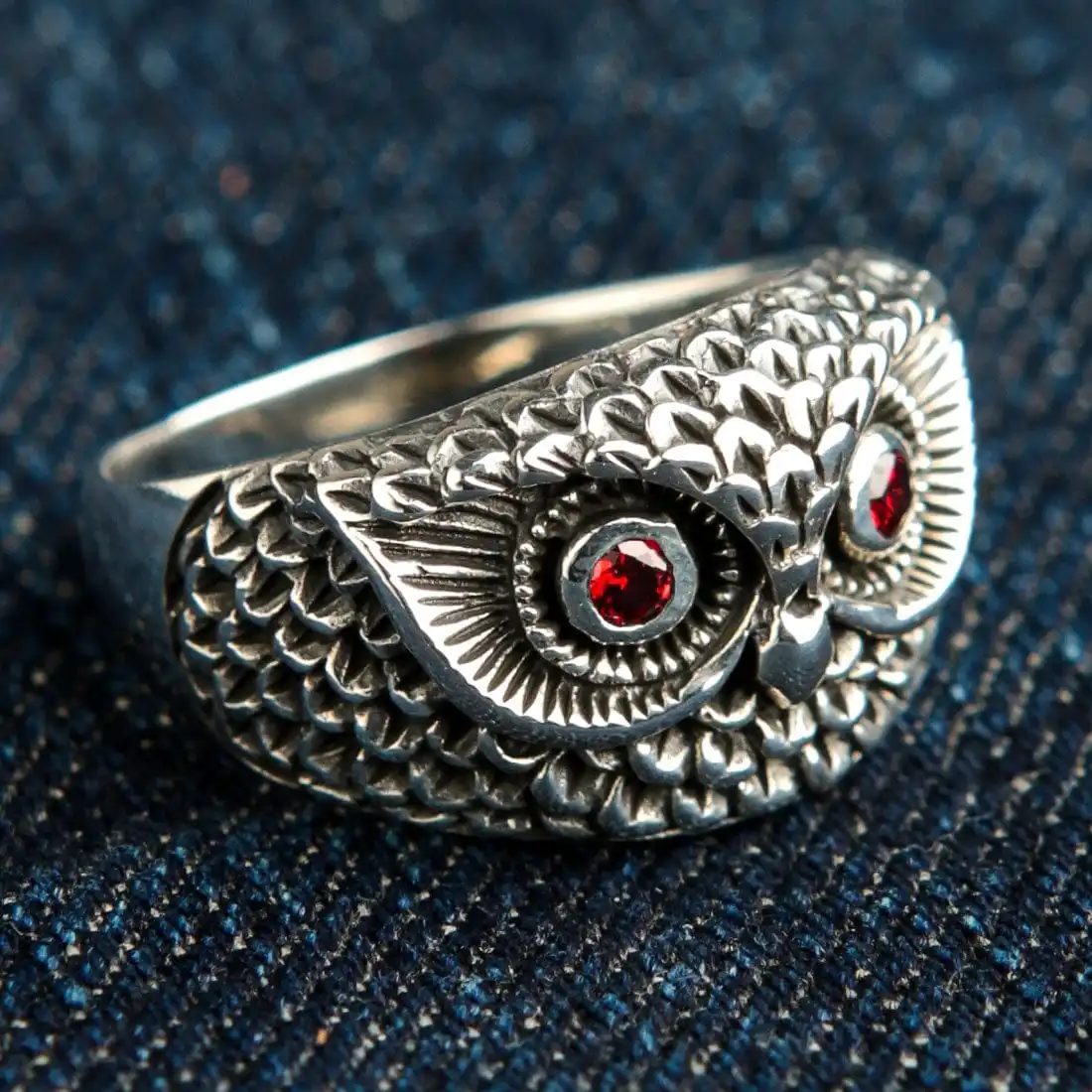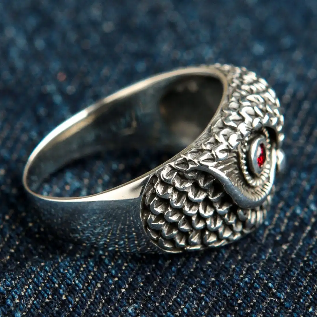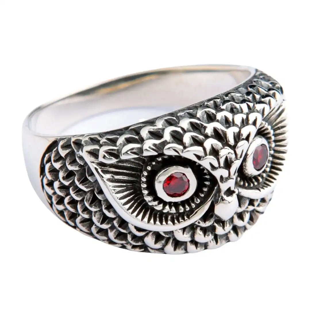 Fans of this wise and mystical bird as well as those after a unique statement piece of jewellery are sure to adore this red eyed sterling silver owl ring.Stunningly carved with the finest wing and feather detail, this striking sterling silver owl ring features two piercing eyes of deep red CZ stone which add a distinctively dazzling effect. With a large, thick band, it’s a ring sure to stand out on any hand.