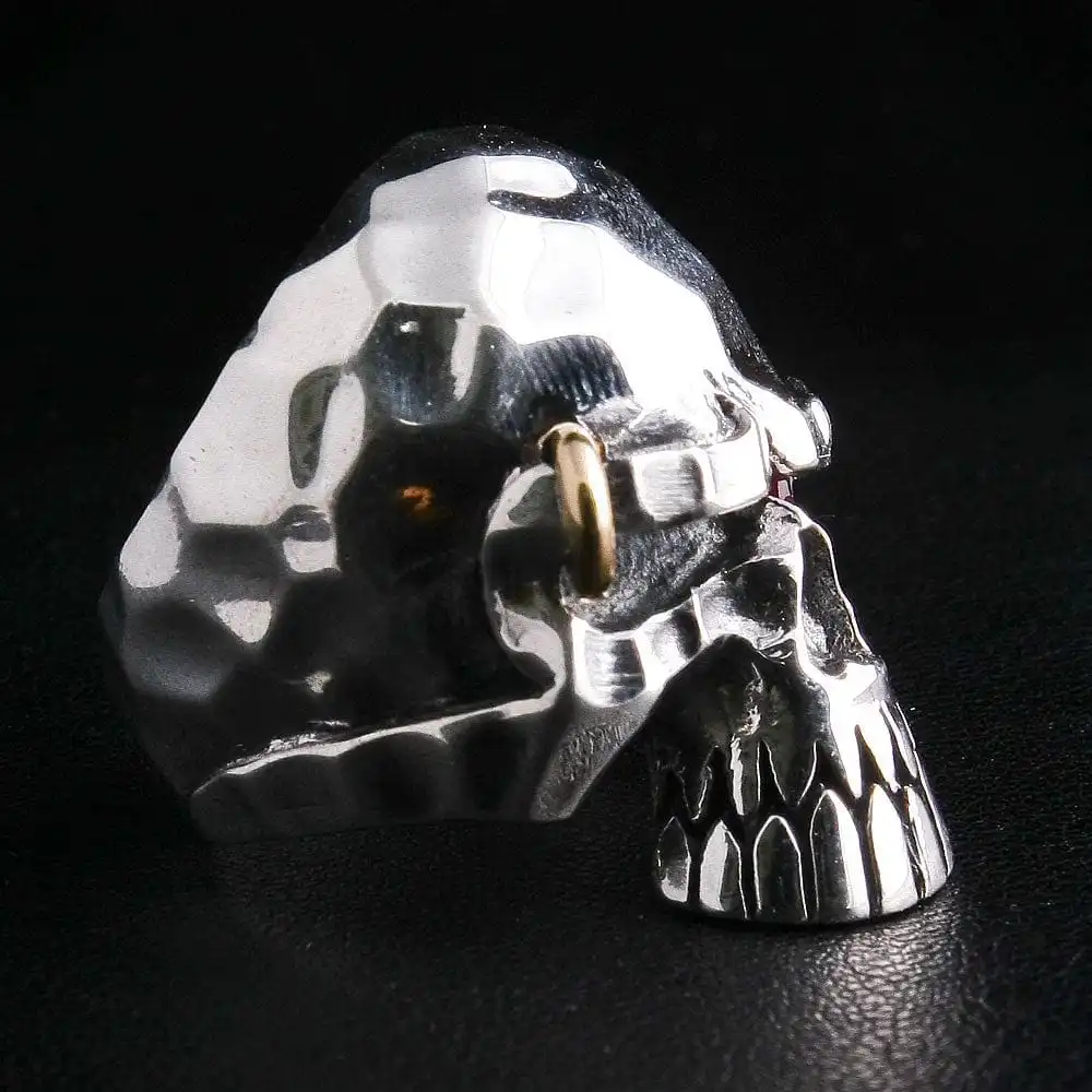 A gold toned eyebrow ring adds character to the classic design for this Punk Skeleton Skull Biker Ring, which has a pronounced brow with hammer detailing, and a solid, weighty, masculine feel that complements both smaller and larger hands. A brand-new addition to our Skull Ring Collection, it is sure to be a best-seller in the coming year.