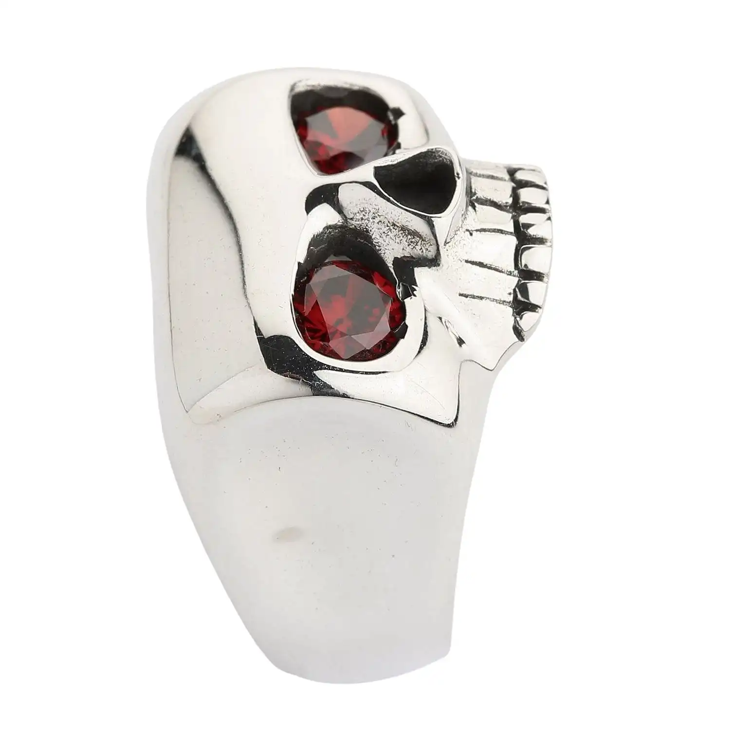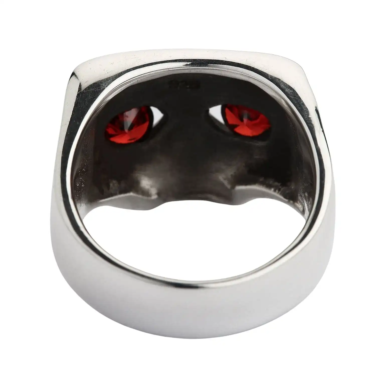 A true denotation of the wicked spirit that lies within you, our red eyes skull ring has a fierce look that is sure to terrify small children and grown adults alike! Intricately carved to ensure realistic detail, every tooth is evident and the deep eye sockets and nose hole are complemented by chiselled cheekbones. The red fire garnets that make up the evil eyes finish a look that is certain to draw some attention.