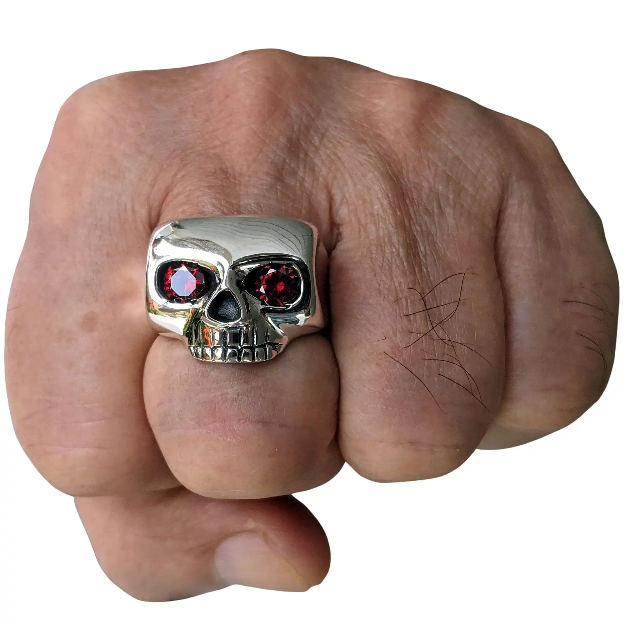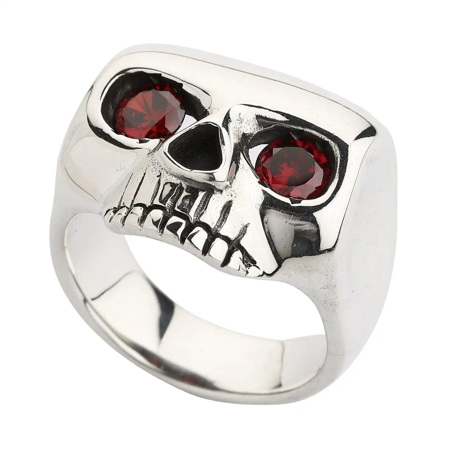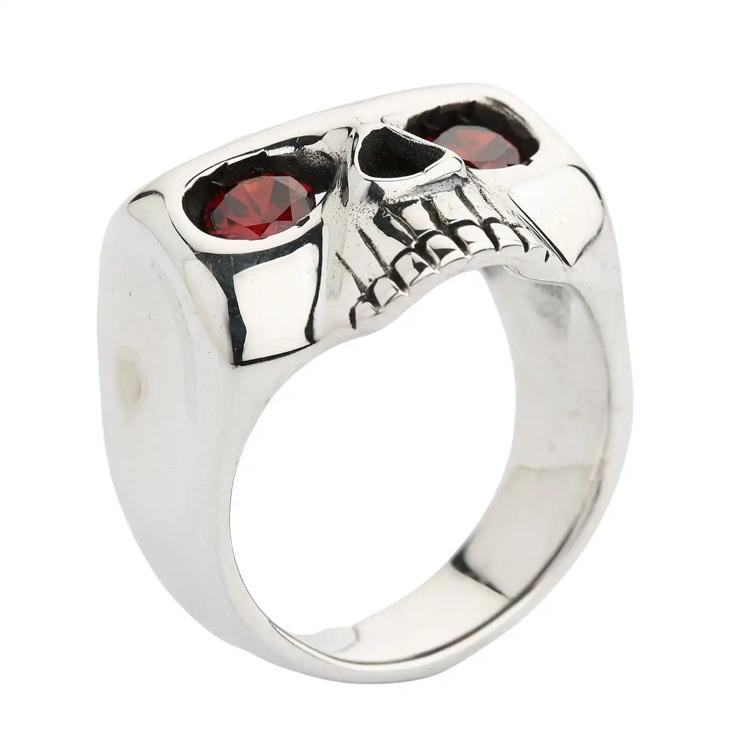 This particular style of skull ring has been crafted from 100% solid sterling silver, with a smooth band that is weighty and thick. The garnet stones bulge into the inside of the band, where the 925 stamp of authenticity can also be found. The skull itself is attention-seeking, measuring 24mm x 22mm, making quite an impression on your hand. If you want this ring to really stand out, wear it on its own, so that it may take pride of place amongst your fingers. For a more toned-down look, browse our ring selection to dilute the symbolism with a variety of emblems above your knuckles.