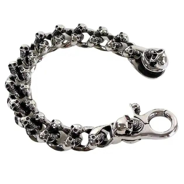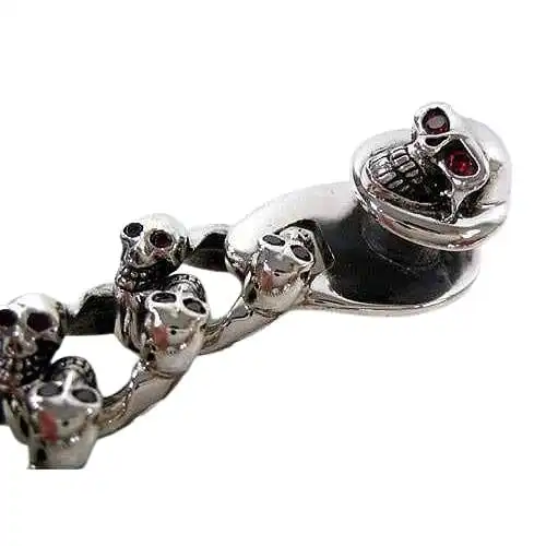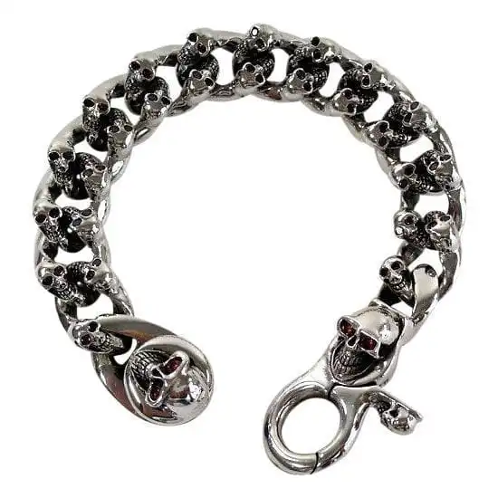 If you favor accessories to impress, this Garnet Eyes Skull Bracelet is sure to fit the box. Inspired by gothic design, it draws its style from the depths of the underworld. Skull faces merge into every single link, seeming to melt out from the darkness beneath and glaring at everyone.