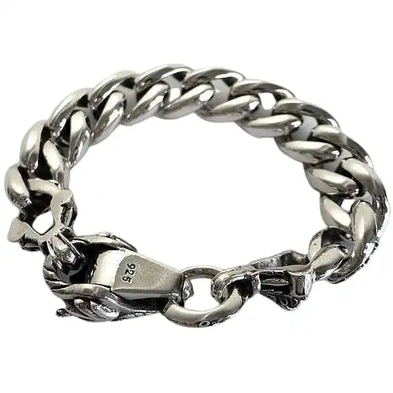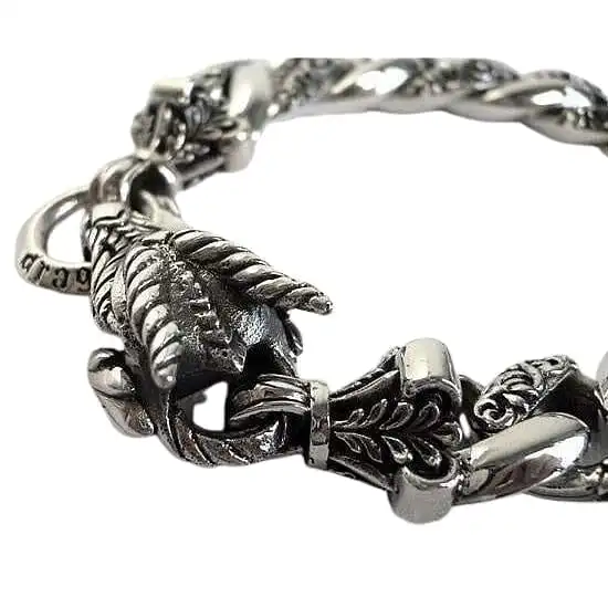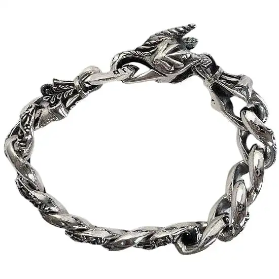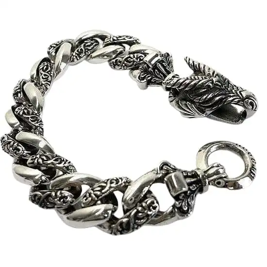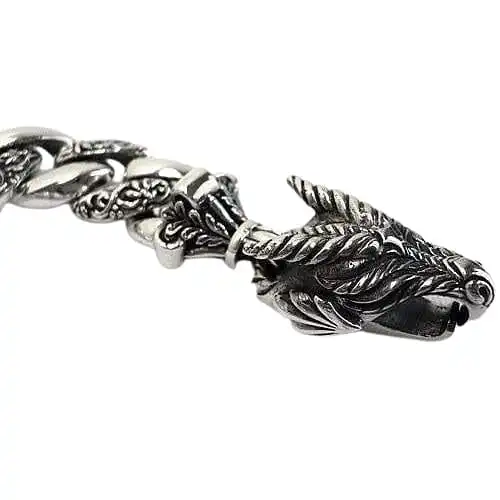 The whole bracelet is made from solid sterling silver. Details have been highlighted and accentuated with darkened hints. Combining a premium weight and intricate design allow this piece to stand out in your collection. And, for security, it fastens through the mouth of the dragon.