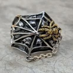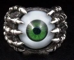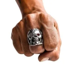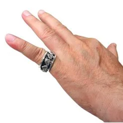 For the man entering the world of accessories, this gothic Skull Blood Ring could be the ideal option. Crafted with true skill and expertise, the simple band design incorporates glaring eyes from skinned skull heads throughout. Around the inner band, the words ‘Skull’ and ‘Blood’ sit darkly – engraved in a unique font and darkened, adding to their menacing allure.