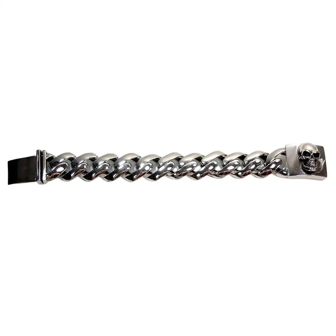 Boasting a premium weight, our Skull Cuban Men’s Bracelet has a bold and masculine design. The thick curb bracelet flexes to sit around the wrist comfortably. Upon the clasps sits a 3-dimensional skull head – complete with menacing grin and sunken eye sockets. Powerful and masculine, this piece has a strength about it to impress the modern man.