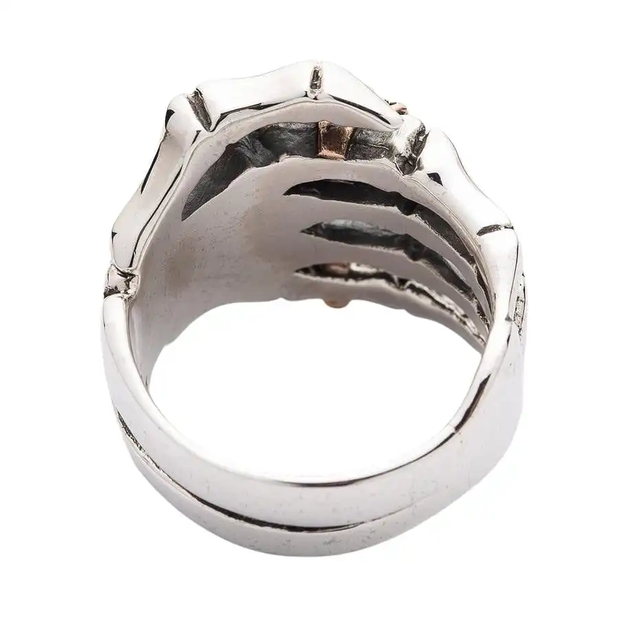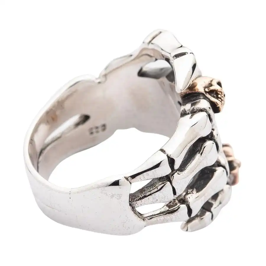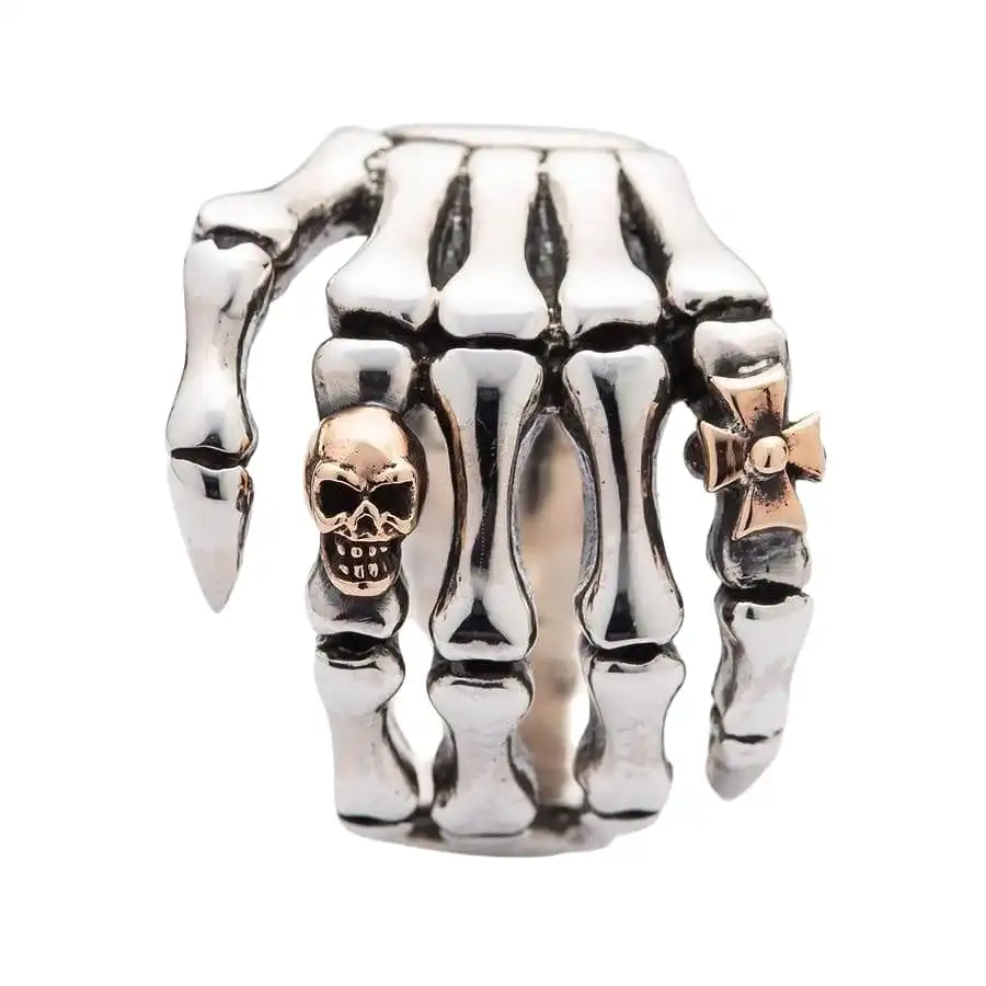 Gain the upper hand on your style with this sterling silver gothic punk skeleton hand ring. Extremely dense, tremendously thick and devilishly distinguished, this robust sterling silver ring features an ominous skeleton hand design across most of the band, which is carved with detailed joints. There are also gold rings embellishing the hand itself, including a gold rocker skull and a cross design.