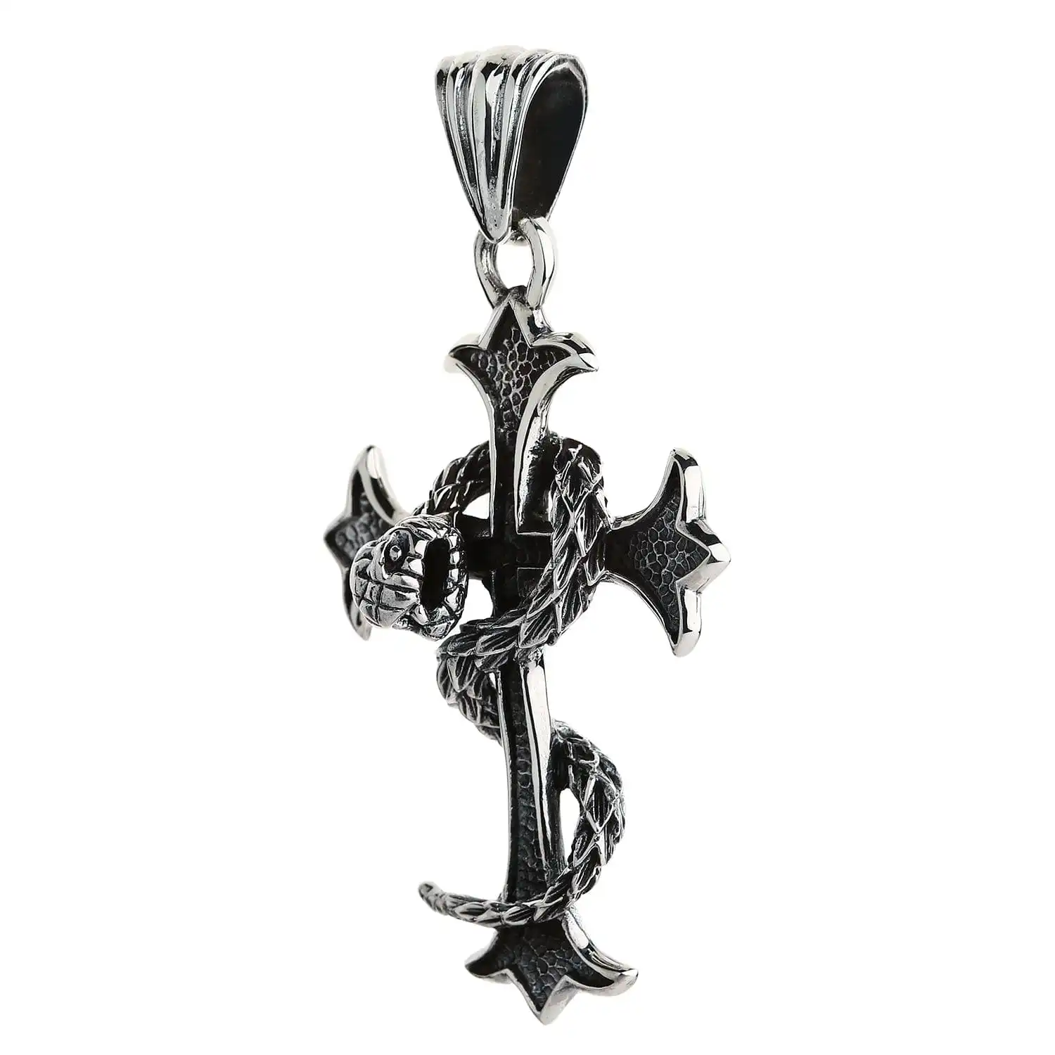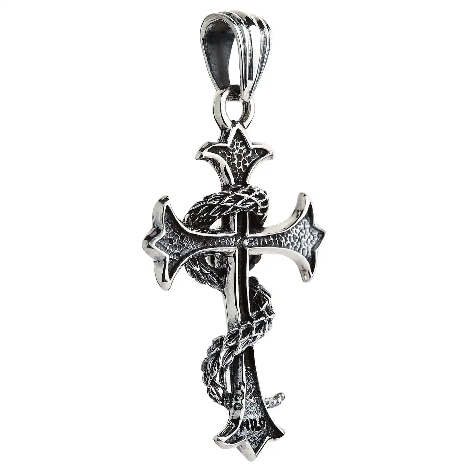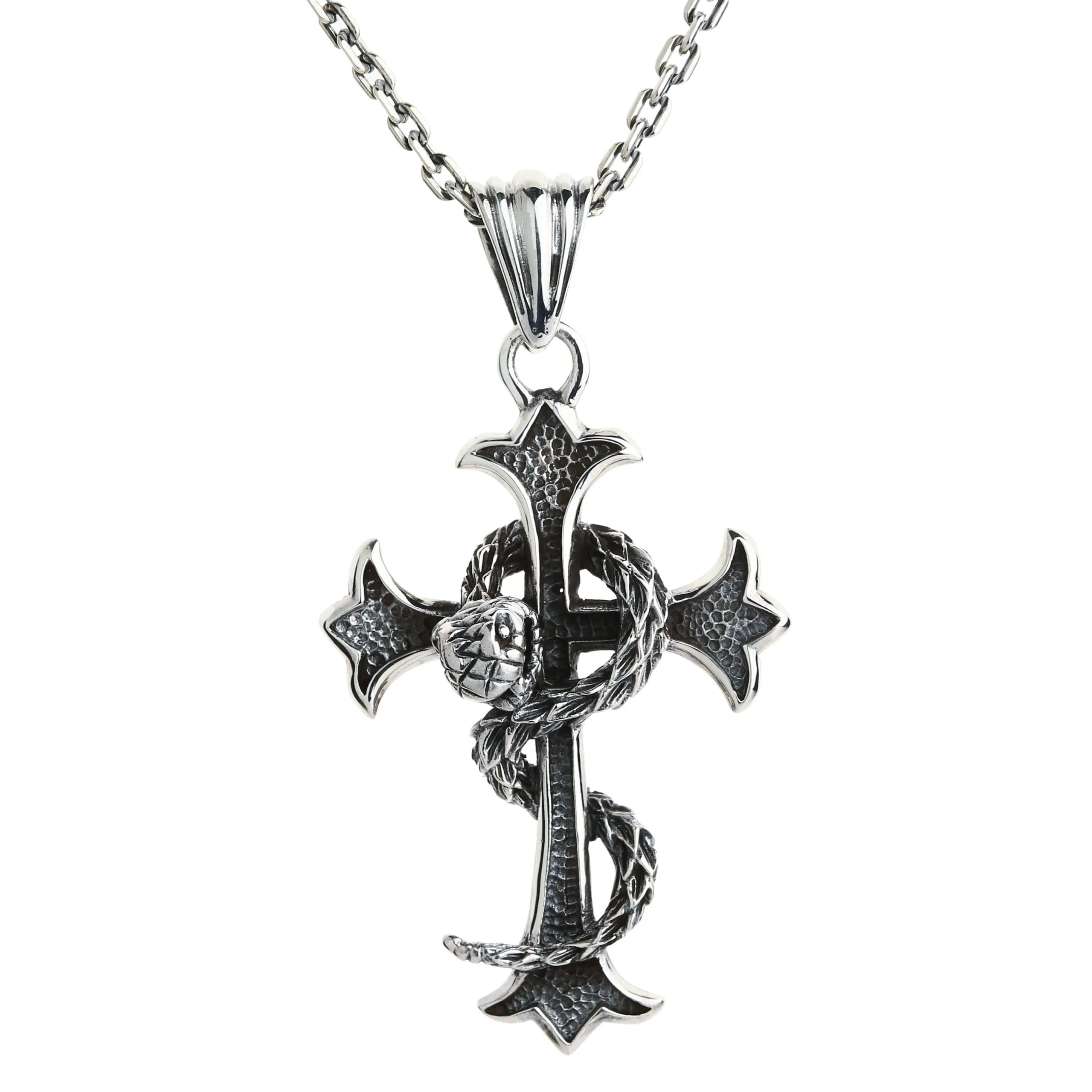 The focal point of this piece is a cross with lily-esque bar detailing. It is a direct reference to fleur de lis, otherwise known as the royal lily, another sought-after Gothic image. Not only does it add an artistic quality to the cross but also imbues it with nobility. One more symbol inherent in this piece is a large snake wrapping around the cross. While the latter represent spirituality, the serpent denotes sinfulness. The juxtaposition of these images has it own meaning – there is no saintliness without sins.This dark and meaningful pendant is cast in beautiful sterling silver. We generously provided it with a blackened coarse texture that is noticeable from far and wide. However, just like black is unimaginable without white, darkened silver can’t exist without light and polished silver. The shiny metal accentuates the cross’ edging and puts an emphasis on the snake’s scales.