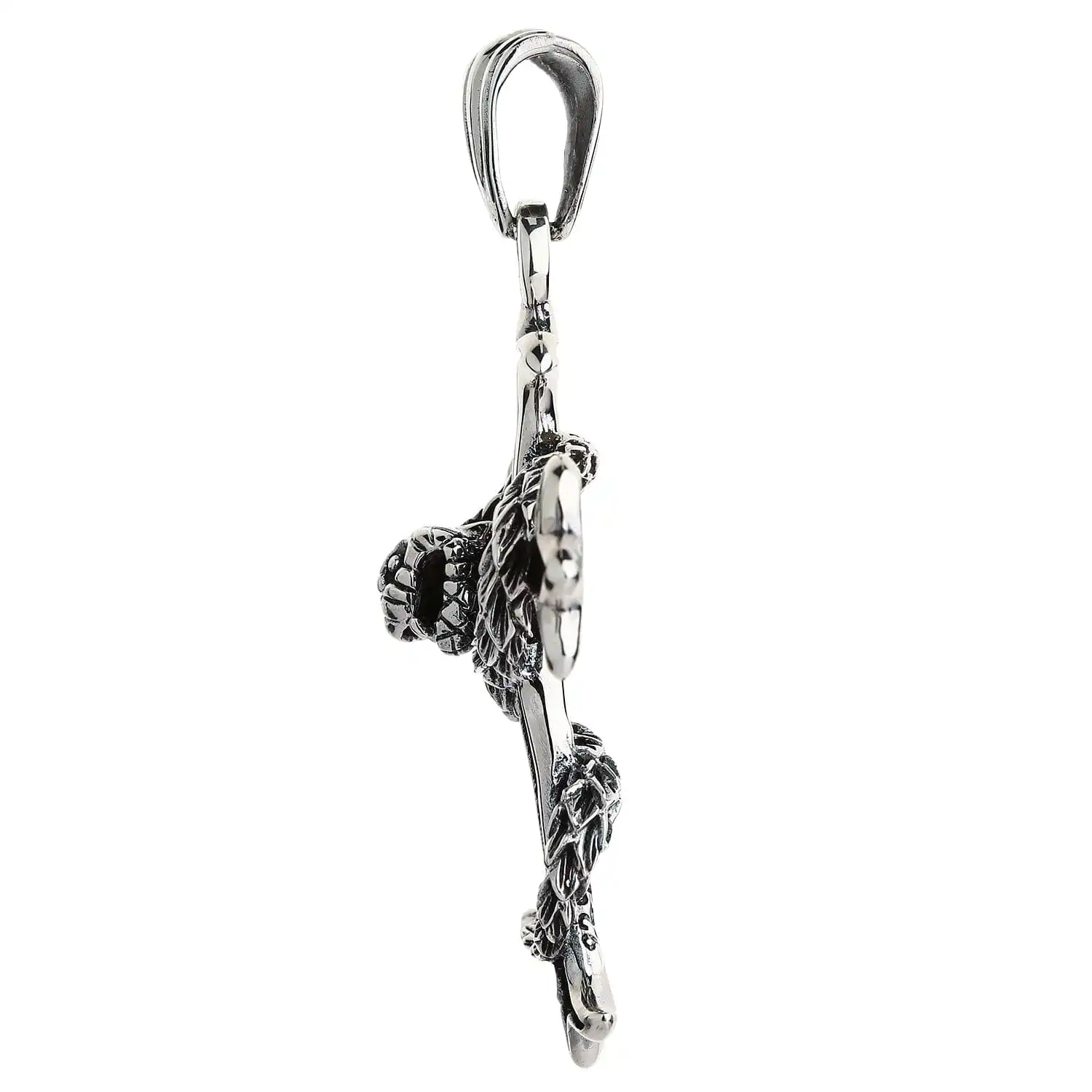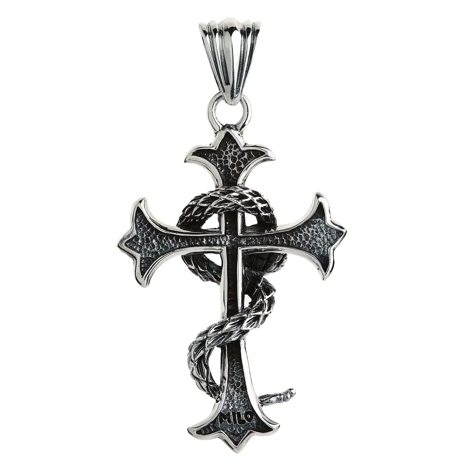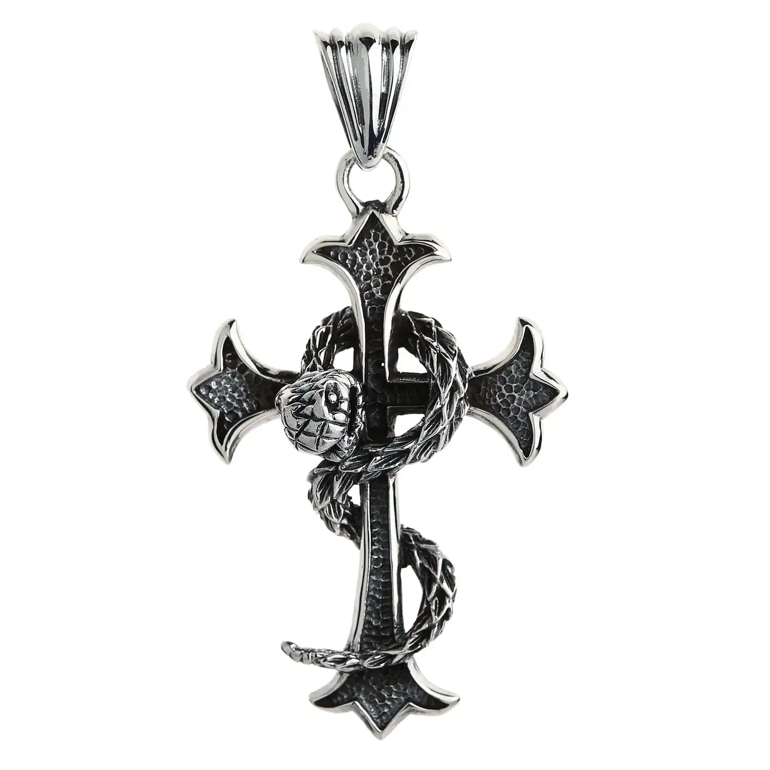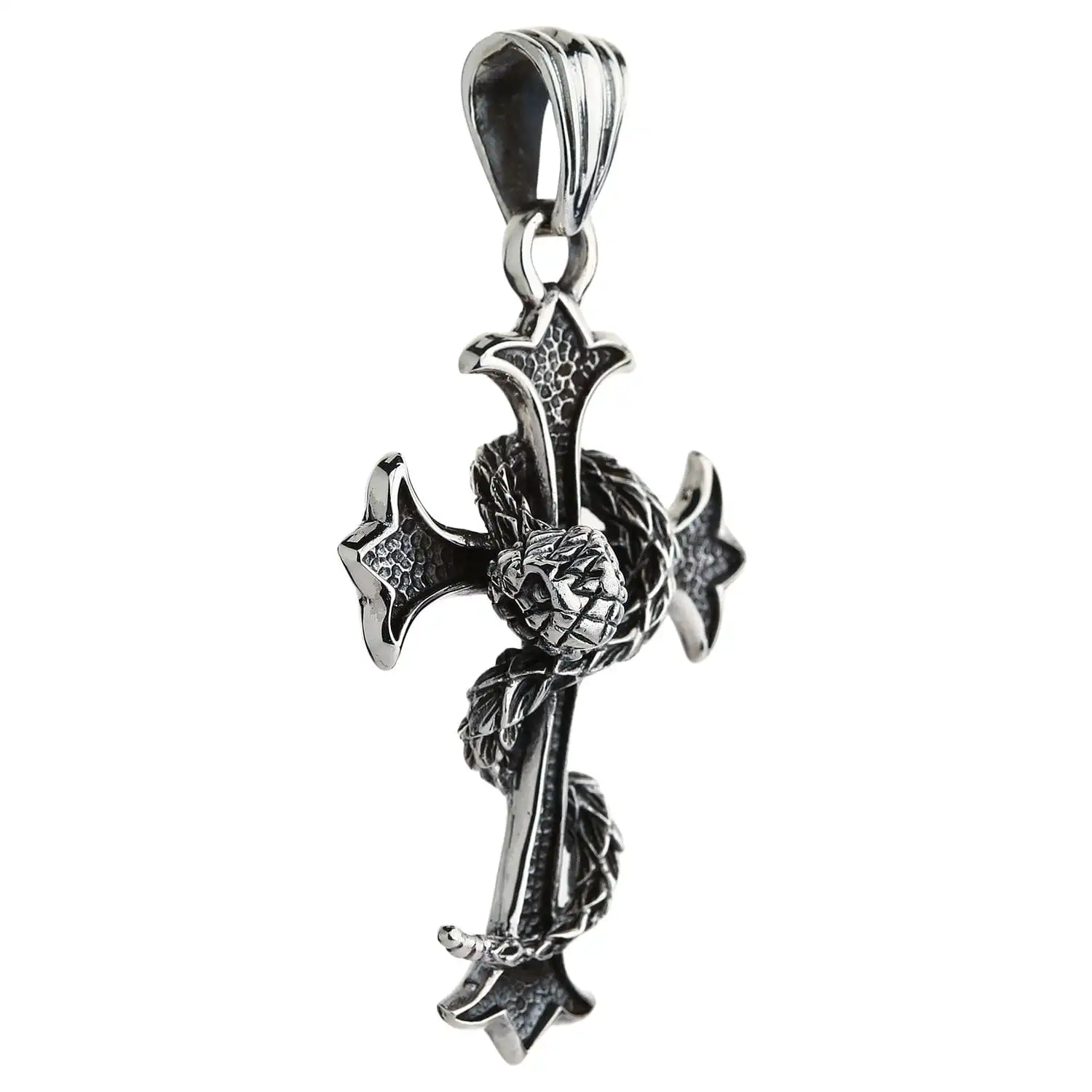 The focal point of this piece is a cross with lily-esque bar detailing. It is a direct reference to fleur de lis, otherwise known as the royal lily, another sought-after Gothic image. Not only does it add an artistic quality to the cross but also imbues it with nobility. One more symbol inherent in this piece is a large snake wrapping around the cross. While the latter represent spirituality, the serpent denotes sinfulness. The juxtaposition of these images has it own meaning – there is no saintliness without sins.This dark and meaningful pendant is cast in beautiful sterling silver. We generously provided it with a blackened coarse texture that is noticeable from far and wide. However, just like black is unimaginable without white, darkened silver can’t exist without light and polished silver. The shiny metal accentuates the cross’ edging and puts an emphasis on the snake’s scales.