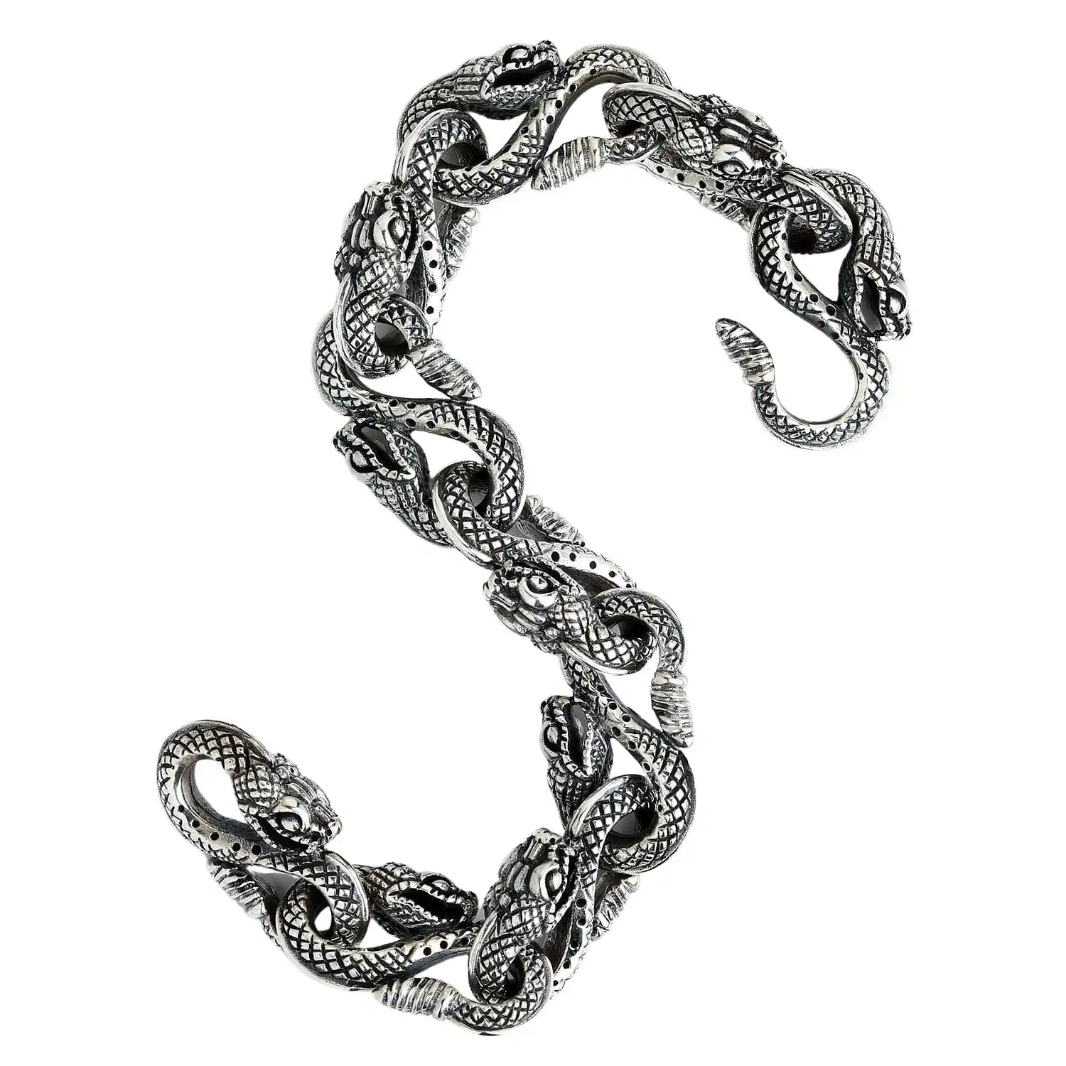 What are these things? A snake is an ancient symbol of health, resurrection, and regeneration. It is dangerous but also wise. As you see, there are plenty of reasons to make a symbol of snake part of your wardrobe. Not to mention, this serpent is beautiful in its color and scale pattern. We attempted to recreate a snake’s signature look in this men’s bracelet and it came out badass.This bracelet doesn’t have standard round links. Instead, each link is a snake that took the S shape – a real serpentarium on your wrist. The snakes’ look isn’t friendly, you can see it in their open, as if hissing, mouth. But don’t worry, it’s a true pleasure to flaunt this snake-adorned piece. It is luxuriously heavy (almost 100 grams of sterling silver!) as befits men’s jewelry, durable, and easy to fasten.