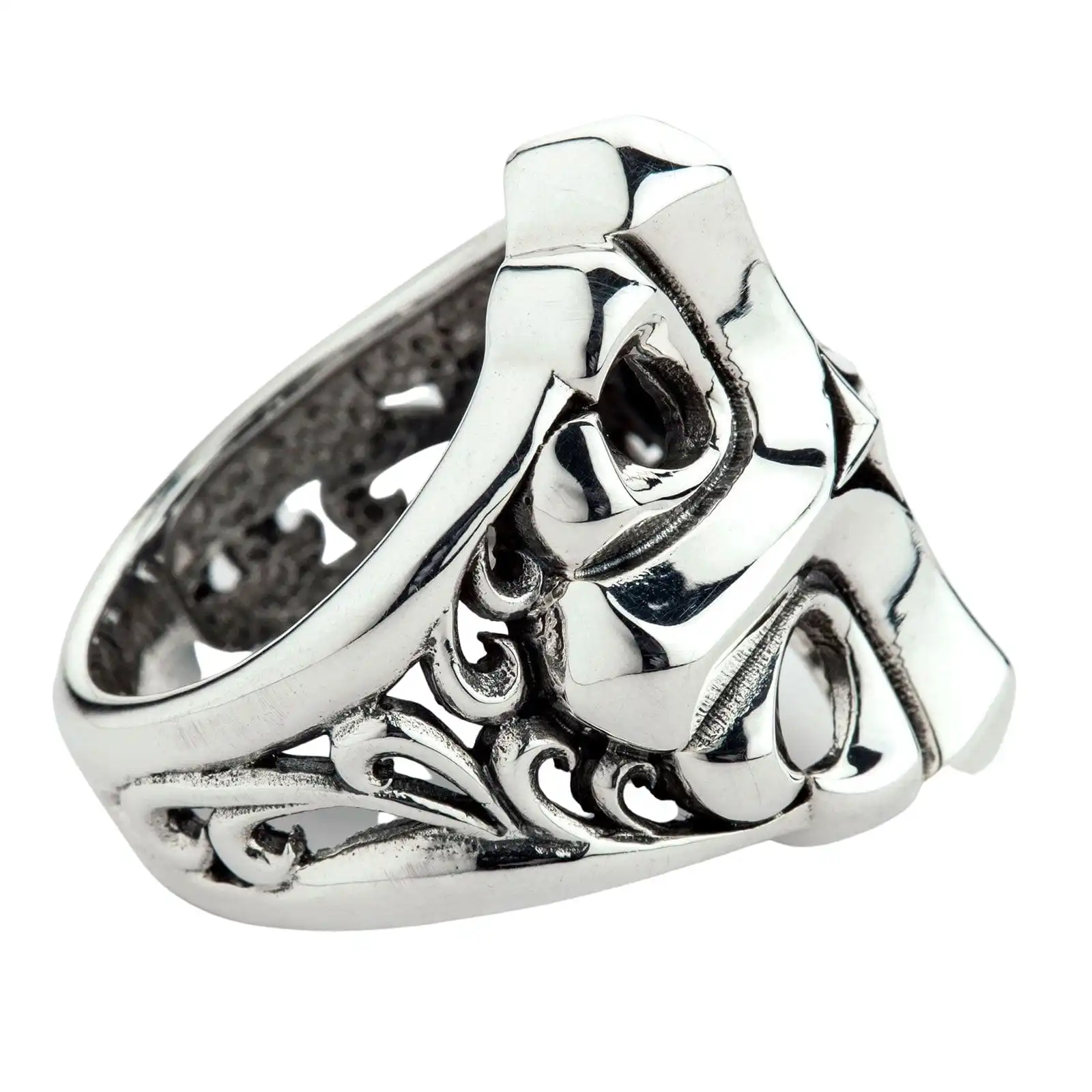 The ring is centered around the fleur de lis symbol otherwise known as the royal lily. This Heralding and Gothic symbol is found on crests of noble families throughout Europe. You don’t need to have blue blood in your veins to flaunt this beautiful image. Courtesy of Bikerringshop, it will take pride of place in your jewelry, no strings attached. The curvy lines of the lily transition into leaves and swirls that spread across the shank. No matter the angle you choose to look at your ring, intricate designs will tantalize the eye.