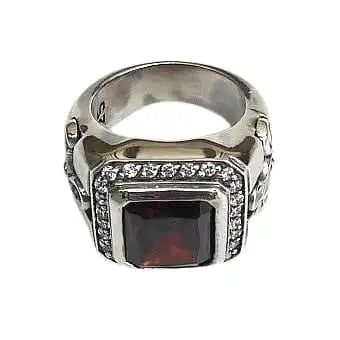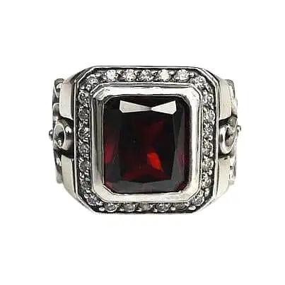Red is the colour of love, passion and adventure or danger, anger and violence, depending on how you decide to interpret it. Either way, this huge red garnet stone is certain to make an impact, perfectly offset by the smaller silver stones surrounding it and the two tribal cross carvings on either side.This stunning ring is made from 100% genuine sterling silver, with the .925 trademark stamp on the inside of the band. Our master silversmith has brought the silver to a high shine finish for a ring that is solid, heavy and thick, made to take up space on your hand.