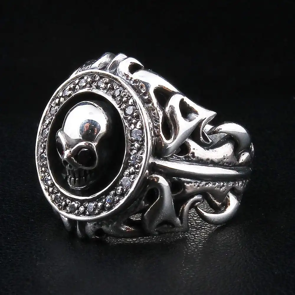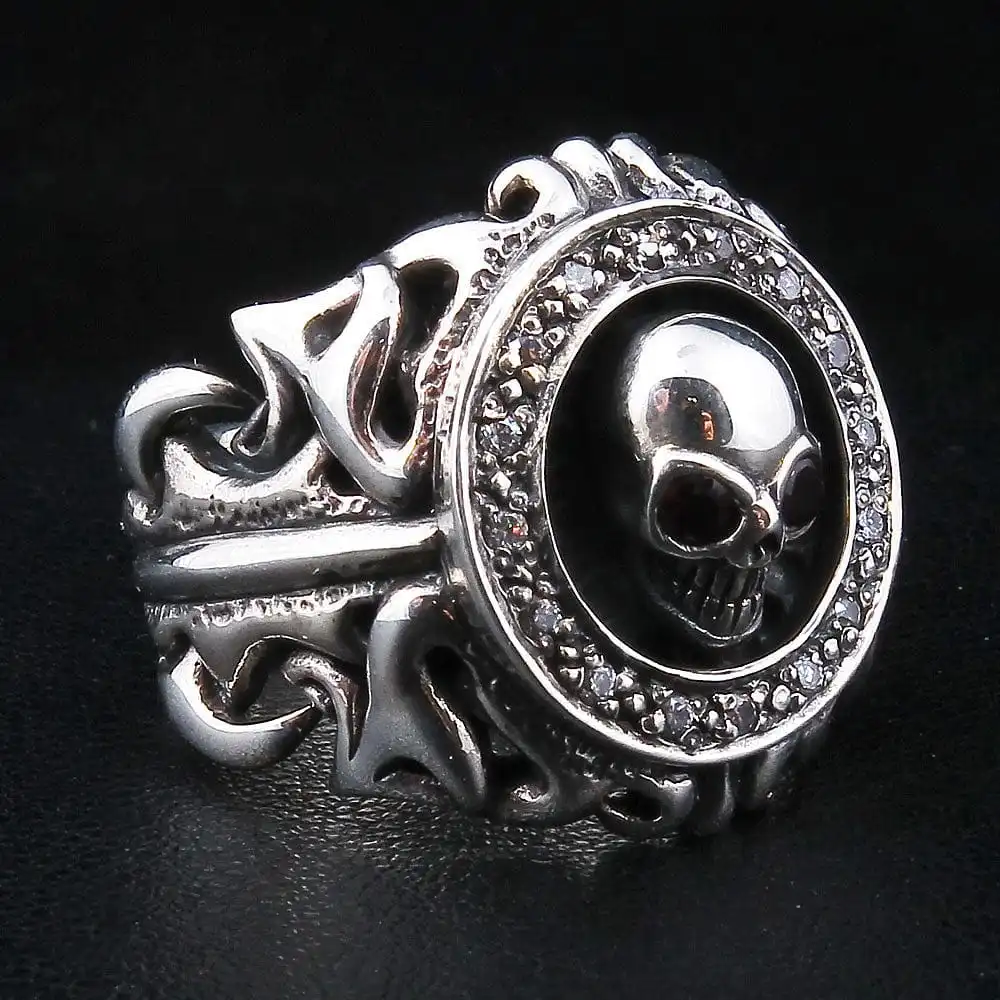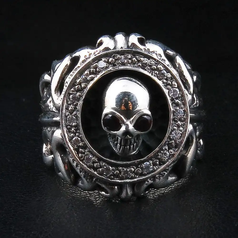 Made of solid sterling silver and featuring a unique design engravings of a skull, this is a one of a kind ring. The center piece skull features two blood red garnet gemstone eyes. Solid and masculine in design, this ring is a must-have for your biker jewelry accessory collection.