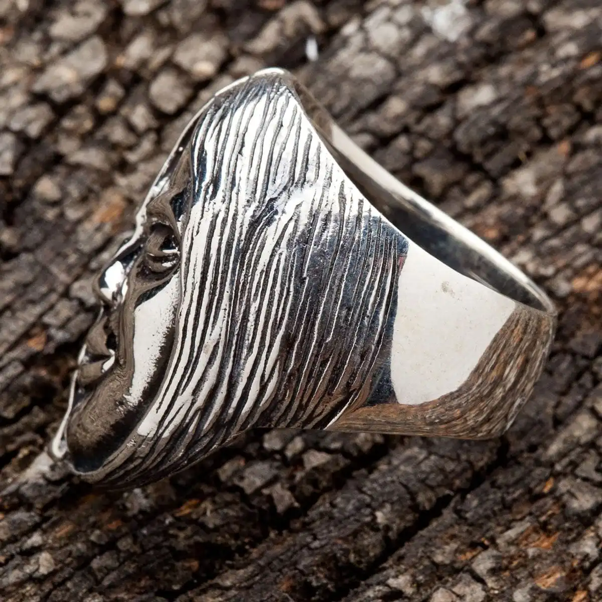 Reminding you to always be wary of those with more than one face, this hypnotising two-face ring features a quirky and unique design that is a little bit creepy and a little bit brilliant. With half of the ring depicting a calm, smiling face and the other half showing a sinister-looking skull, this ring is an indication that all is not always as it seems.Set inside the eye socket of the skull is a glistening red stone that draws the eye to your hand. The entire design has been carved out of genuine solid sterling silver, creating a ring that is thick and heavy, with the .925 trademark stamped inside the band.