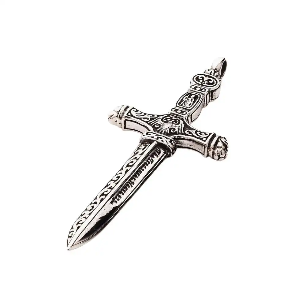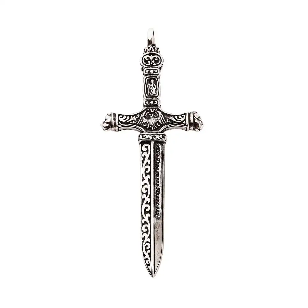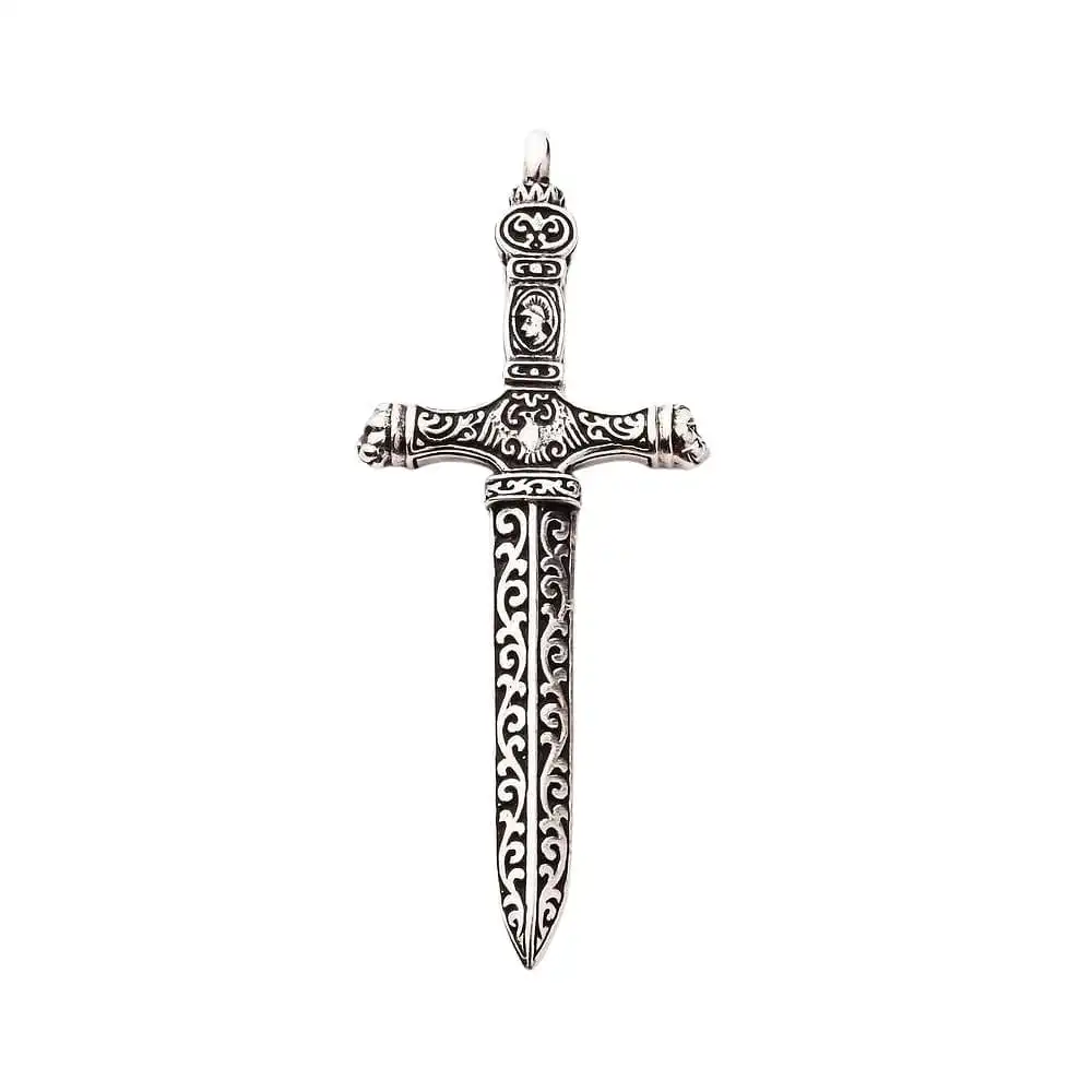 When creating this pendant, we drew inspiration from everywhere. Floral patterns on the blade, as well as fleur-de-lis on the pommel, clearly speak of the Gothic influence. At the same time, the embossing on the sword’s hilt is adorned with Scandinavian patterns. If you look closer, you will notice a Roman Empire warrior in the traditional galea helmet on the front and a warrior with a shield and a spear on the back of the grip. The central portion of the guard carries the image of a two-head eagle while its edges are adorned with two three-dimensional lion heads. Although we took these symbols from various epochs and cultures, they all have something in common and this something is masculinity and boldness.The whole piece is made of 925 sterling silver. While its raised designed are meticulously polished, recessed patterns are blackened for extra depth and definition. The back of the pendant carries the 925 hallmark stamp along with the Treasure Heart writing.