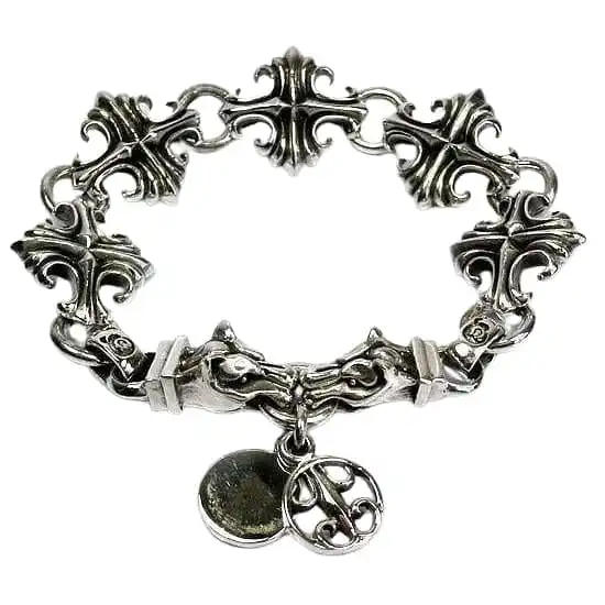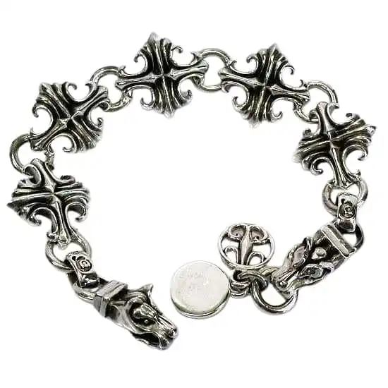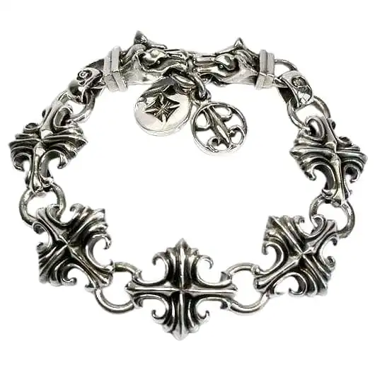 It is entirely constructed from solid sterling silver – from the detailed cross chain to the duo decorative disc charms. The entire bracelet sits flush against the wrist and fastens securely for safe, all-day wear. Make a statement, demand attention and express the boldest part of your personality.