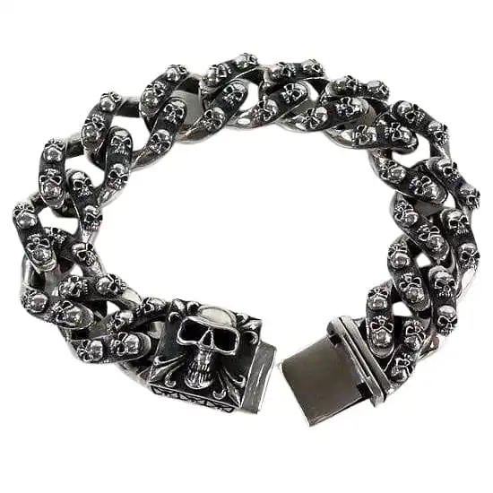 Certain to stun, this is one hell of spine-tingling skull bracelet.Devilish, thick and heavy, our unique tribal sterling silver skull bracelet features extraordinarily in-depth carving, with the tiny skulls littered along the top of every single link and eerie, cavernous holes on the interior side. A larger, menacing looking skull adorns the clasp.