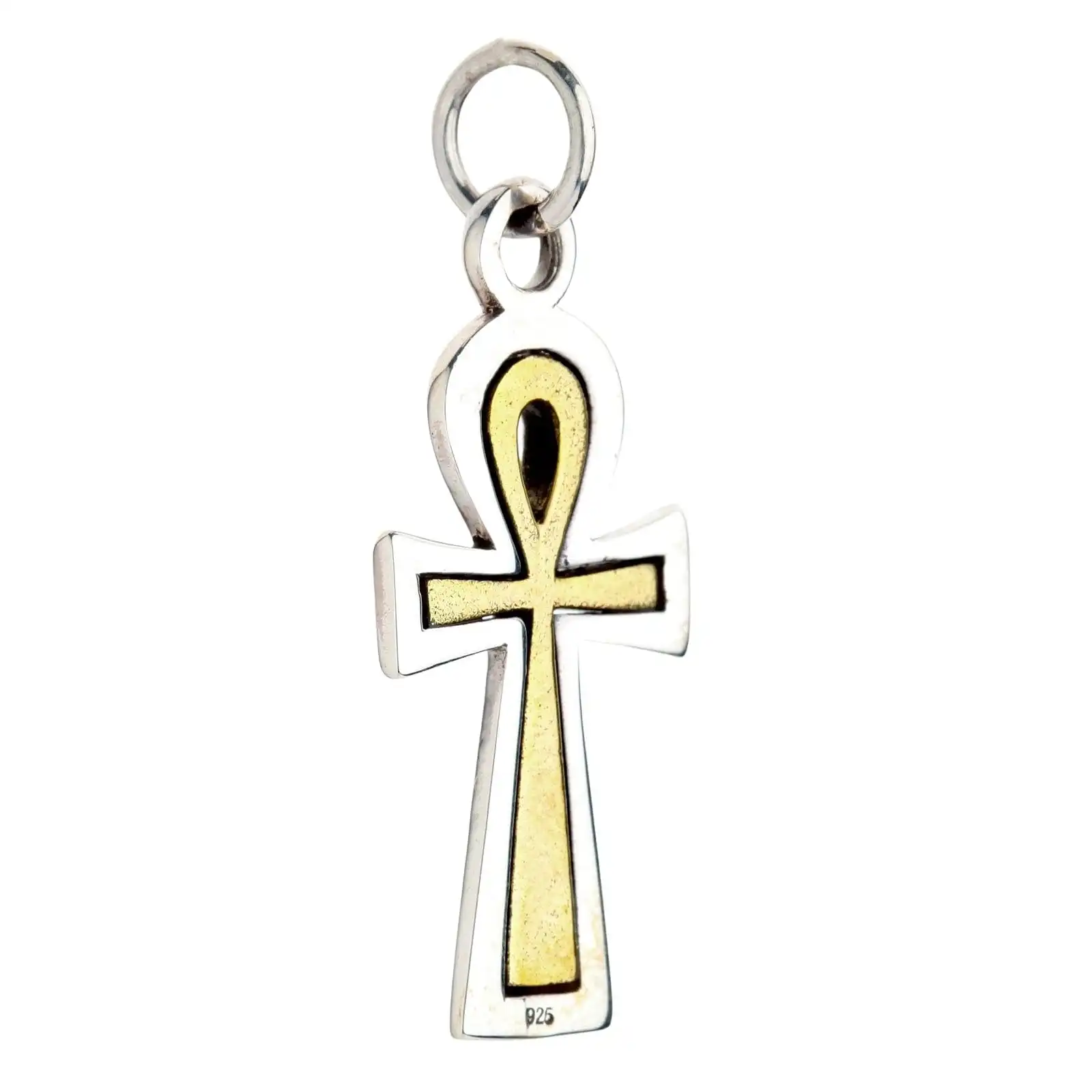 This piece consists of two ankh crosses. The larger one is made of polished sterling silver. The other one is finished with brass emulating yellow gold. This detailing features a rugged texture that enhances the feeling of duality. In fact, Ankh itself is a two-fold symbol. It stands for eternity, immortality, and life itself. At the same time, since the 20th century, it is associated with vampires, the creatures that bring death. Perhaps, this contradiction is the reason why Egyptian Ankhs spark interest in every corner of the world.