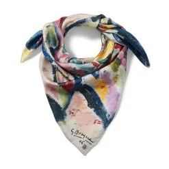 The stylized birds and flowers on our luxurious scarf come from a blue-resist curtain panel, probably made in America around 1725–75, and now in The Met collection. Typically crafted by applying a dye-resistant substance such as wax to a pattern on a piece of cloth which was then dipped in an indigo bath, the origins of blue-resist fabrics have long bewildered scholars. Once thought to be the earliest American-made printed textiles, they were more likely commissioned from Indian artisans by the East India Company and exported to the colonies, where they were made into bed hangings, quilts, and curtains.