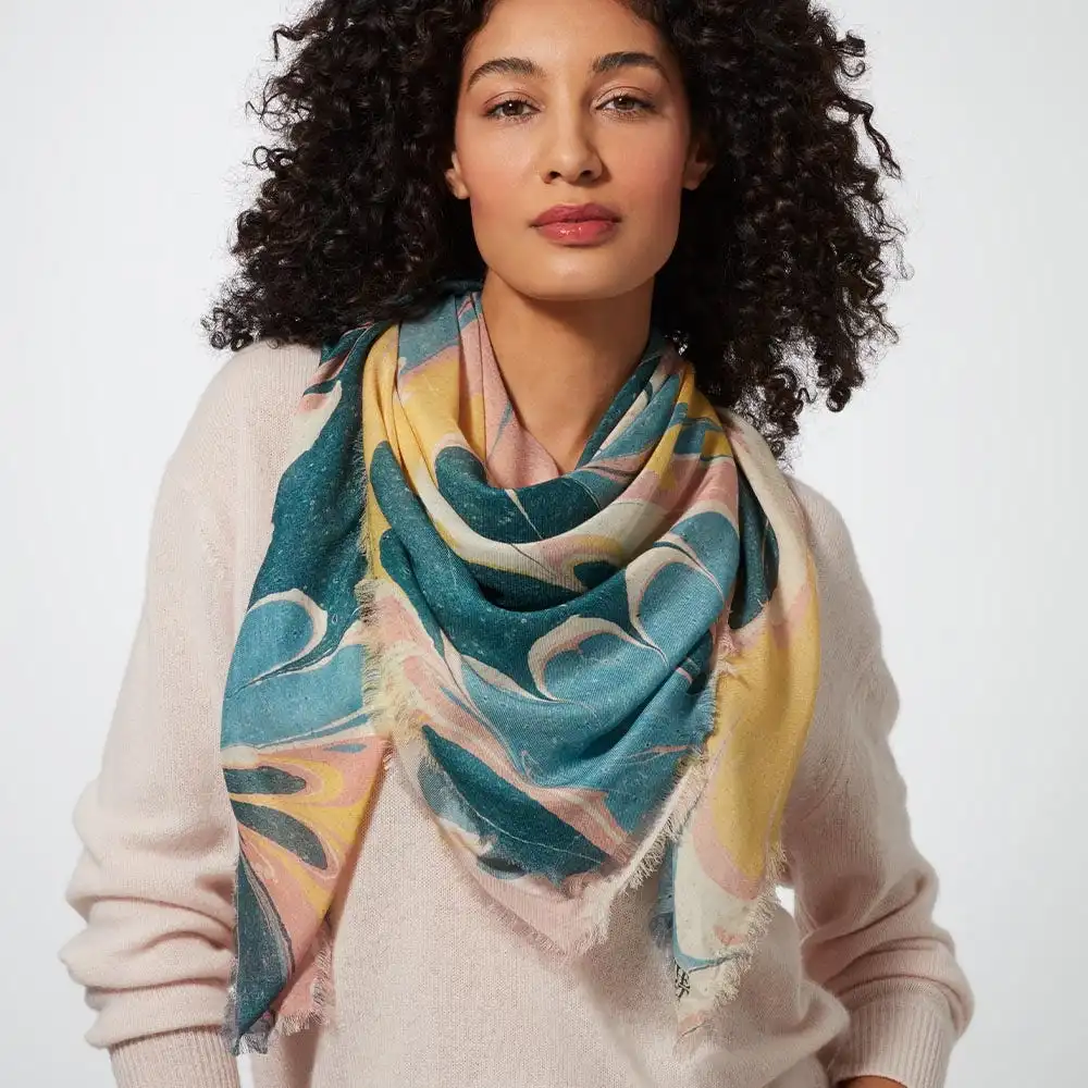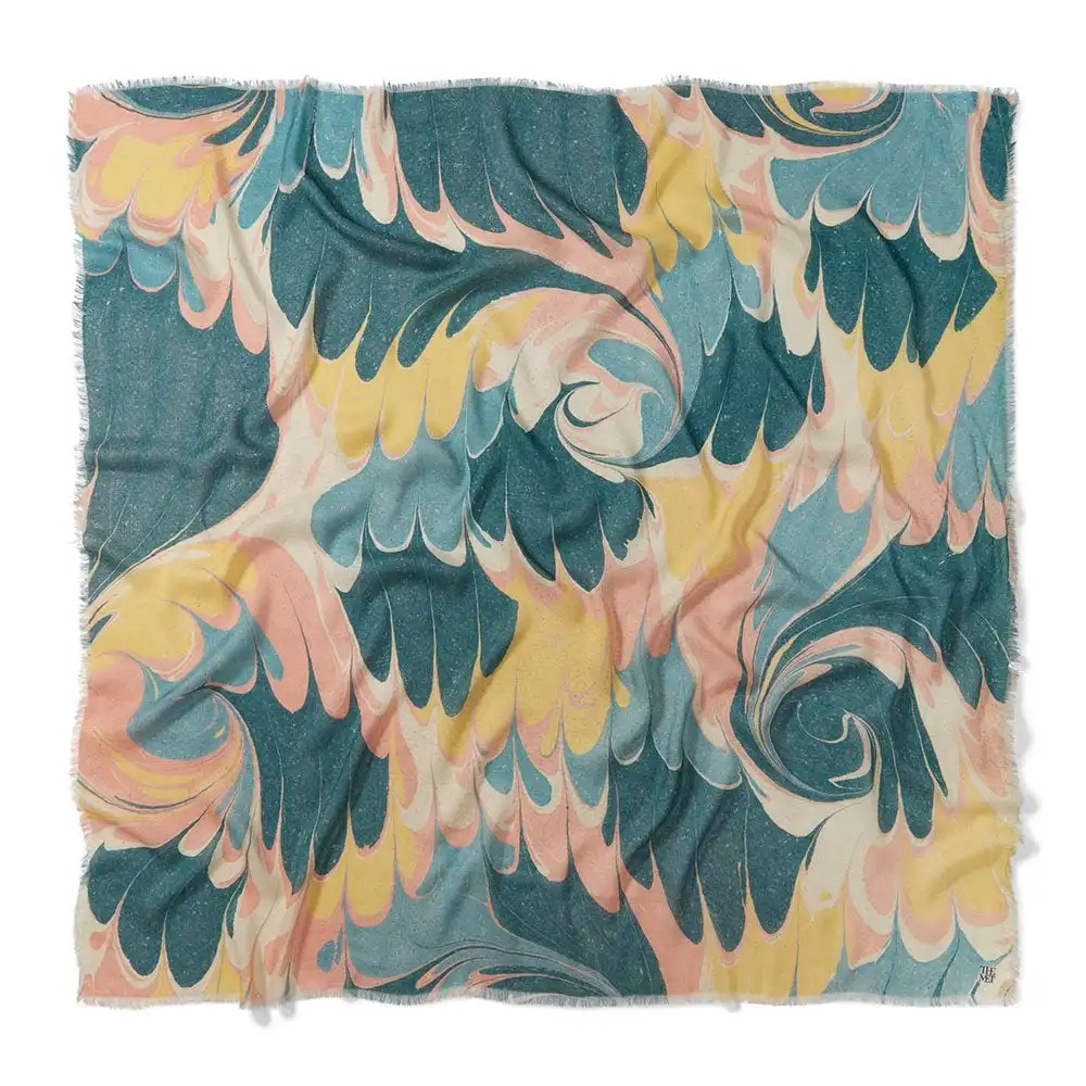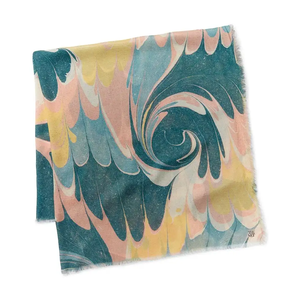 The centuries-old practice of marbling paper yields astounding patterns. While techniques vary between cultures, marbling typically refers to a method of transferring colors from the surface of a water bath onto a piece of paper. The mesmerizing motif on this stylish square silk scarf embellishes the endpapers of Le mobilier français du XVIIe et du XVIIIe siècle, a 1902 catalogue about French furniture, decoration, and ornament at the Louvre in Paris, now in the collection of The Met’s Thomas J. Watson Library.