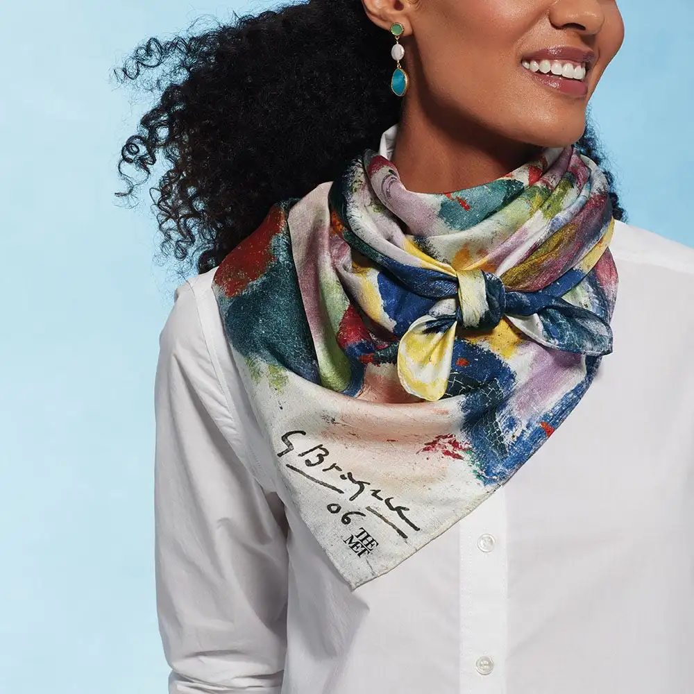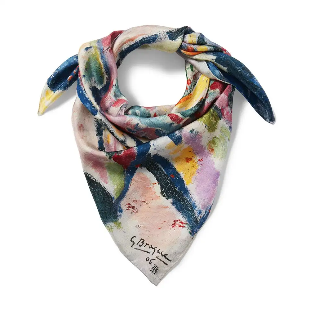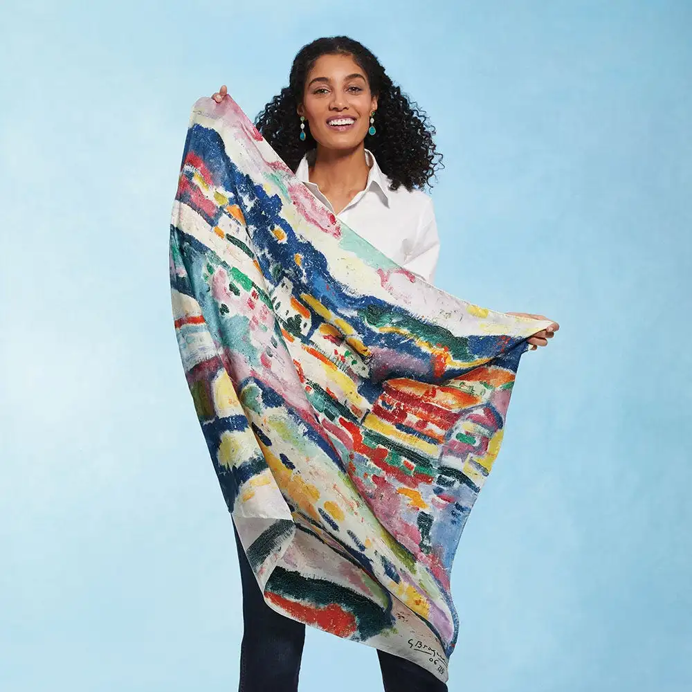 Our silk scarf reproduces a detail from Boats on the Beach at L’Estaque (1906), an evocative oil painting by Georges Braque (French, 1882–1963) in The Met collection. Braque encountered Fauvism at the Salon d’Automne of 1905, after which he briefly experimented with the style. This harbor view of L’Estaque, a Mediterranean fishing village that attracted Braque, as well as André Derain (French, 1880–1954) and Paul Cézanne (French, 1839–1906), exhibits the bright colors, broad outlines, and flattened space of a Fauvist composition.