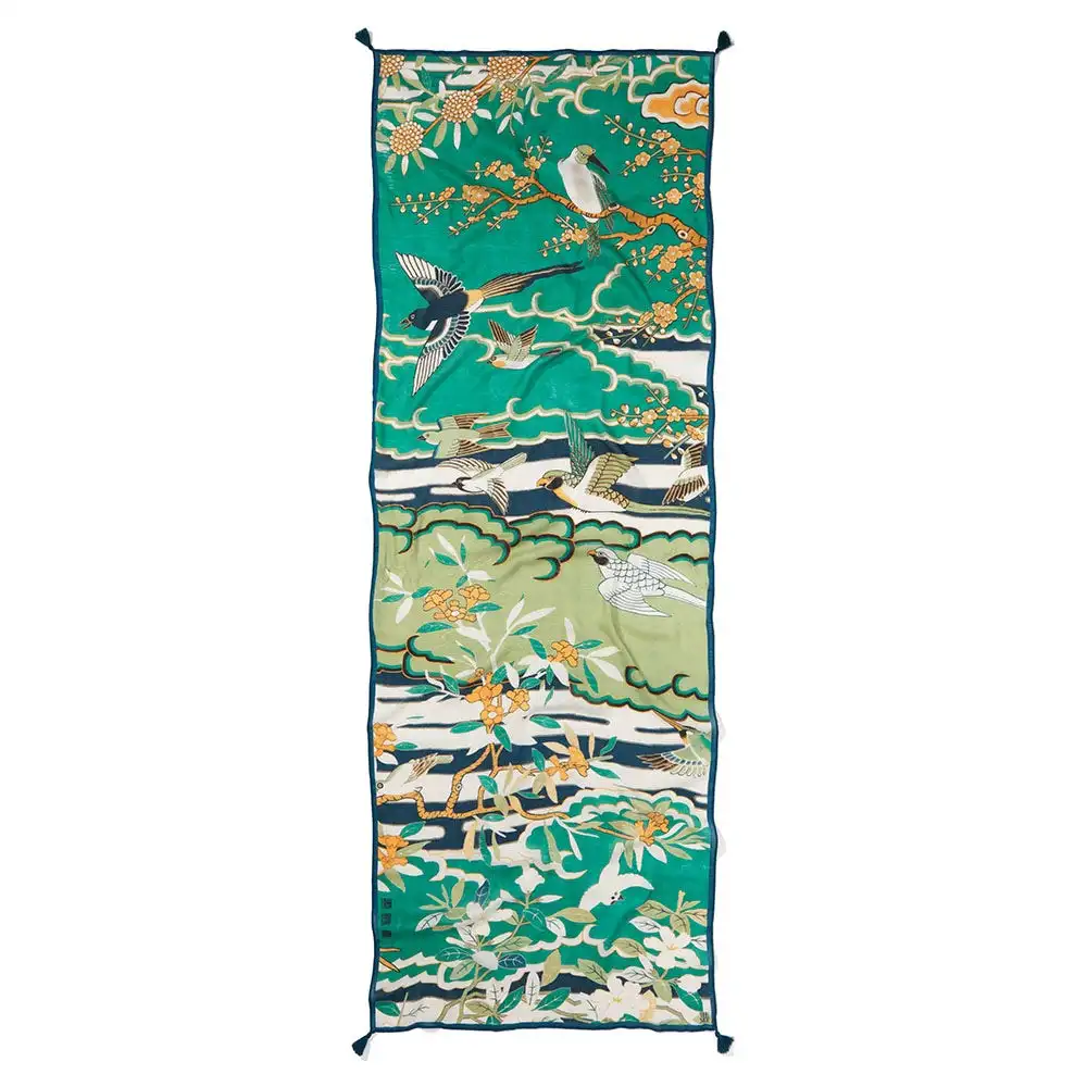 Elegant birds fly among flowering branches and swirling clouds in this idyllic scene adapted from a Ming dynasty–era tapestry. Crafted in 17th-century China and now in The Met collection, it was probably created as part of a larger decorative panel featuring hundreds of birds watched over by a phoenix. Said to appear in divine places, the mythological phoenix symbolized a righteous ruler with loyal officials.
