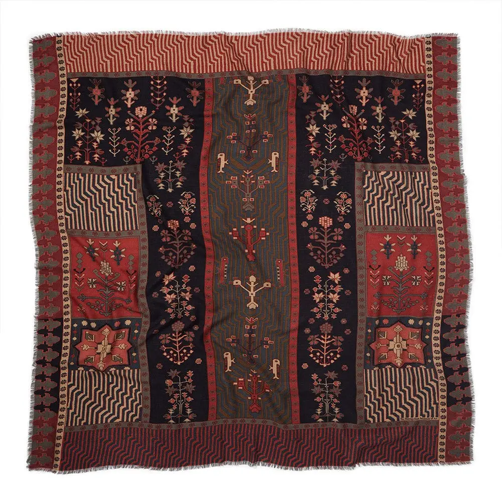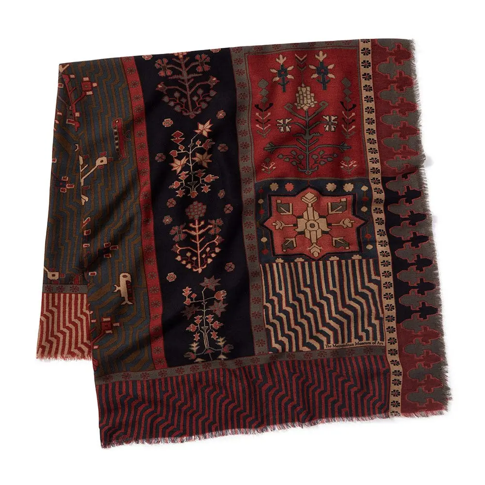 Our striking wool scarf is inspired by a cotton-and-wool carpet in The Met collection. Depictions of such Persian gardens in carpets generally combine a bird’s-eye view of a classic four-part garden with a profile of birds and trees. This particular carpet, made in Kurdistan during the second half of the 18th century, bears the traditional pattern of a garden enclosure divided into rectangular plots, with water in canals suggested by parallel stripes.