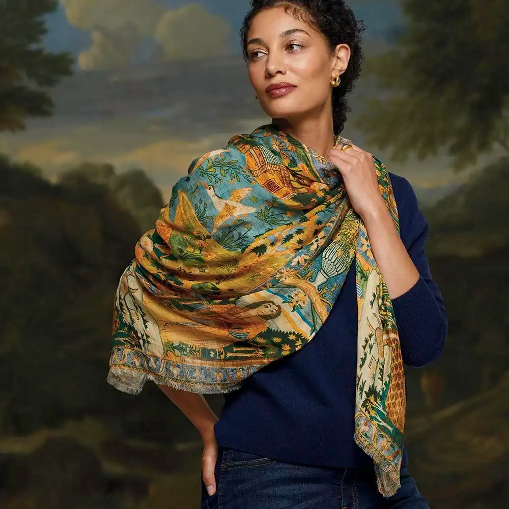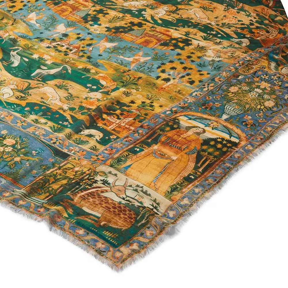 This striking oversize scarf evokes a spectacular pictorial carpet made in 17th-century Iran and housed at The Met. Featuring a European pictorial perspective and border compartments inhabited by figures in European-style dress, the textile’s composition is evidently inspired by contemporary Flemish tapestries; however, the technique and execution are distinctly of the Safavid court. The carpet’s Western influence indicates that it may have been woven in Iran for export or, perhaps, intended as a diplomatic gift.